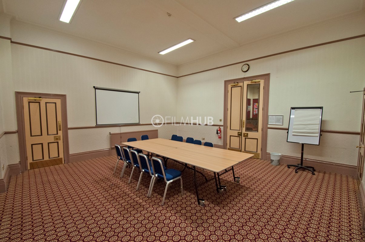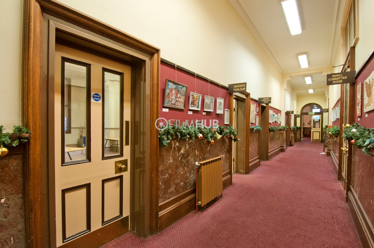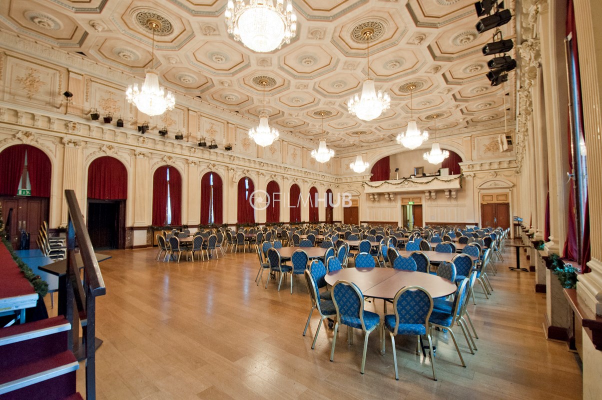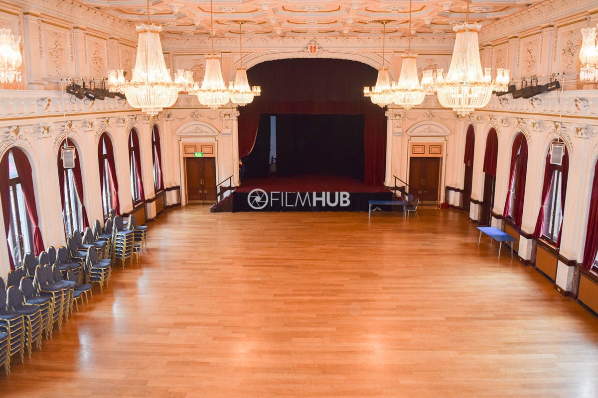The larger of the two halls (The Main Hall) offers chandeliers, a wooden floor, large windows a main stage and lighting deck/balcony. It is also equipped with a bar and kitchen as well as holding areas/green rooms attached. The smaller hall (The Council Chamber) offers chandeliers, and a cosier space befitting of an auction hall or boardroom.