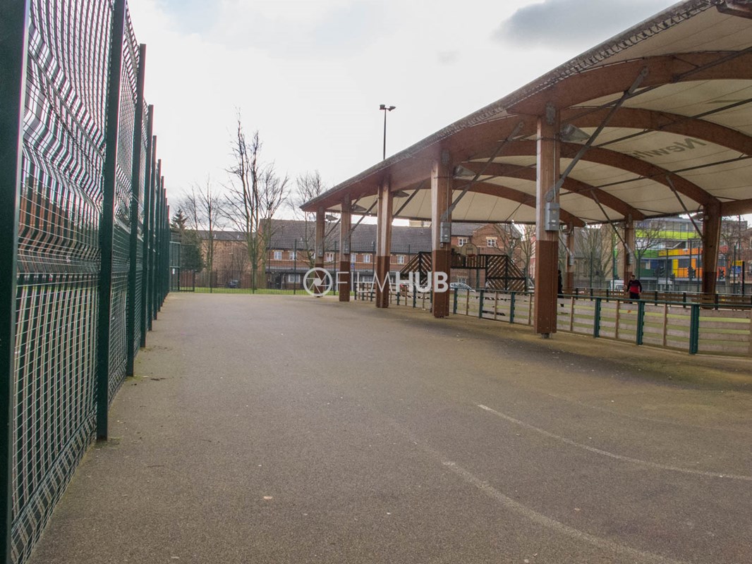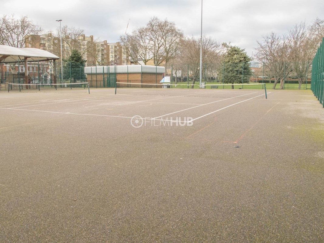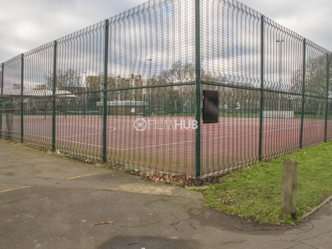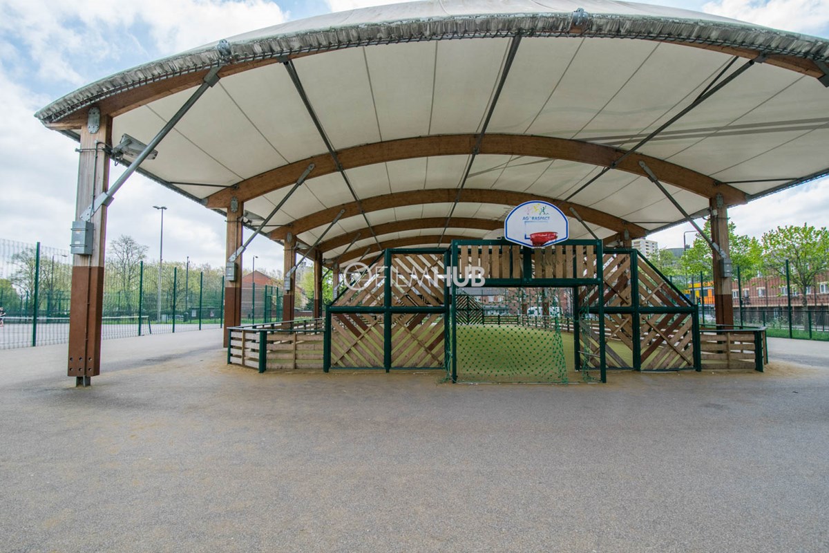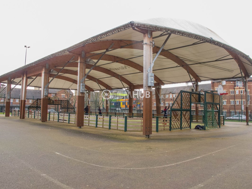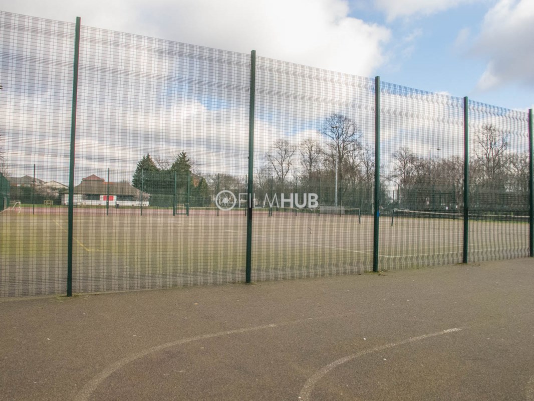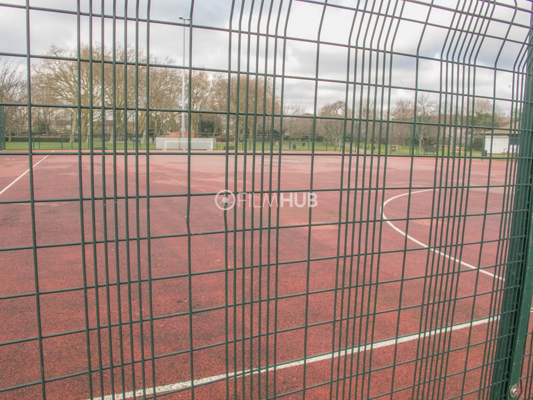 Stratford Park is a large park that is fenced by traditional, black, metal railings with prominent gate pillars at the entrances to the park. The park offers a variety of activities - there is a bowling green that comes with an out building, a basketball court, floodlit 5-a-side football pitch with an all weather surface and canopy, a floodlit multi-use games court, a floodlit tennis court and a normal tennis court.