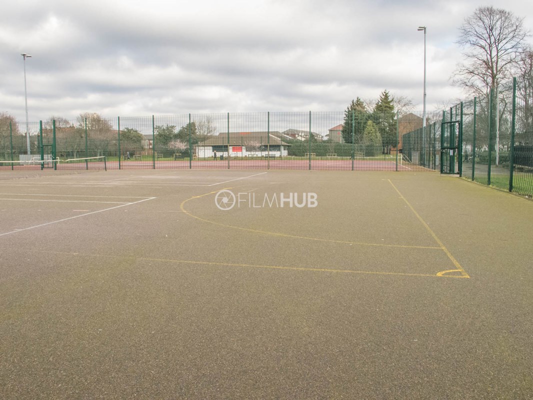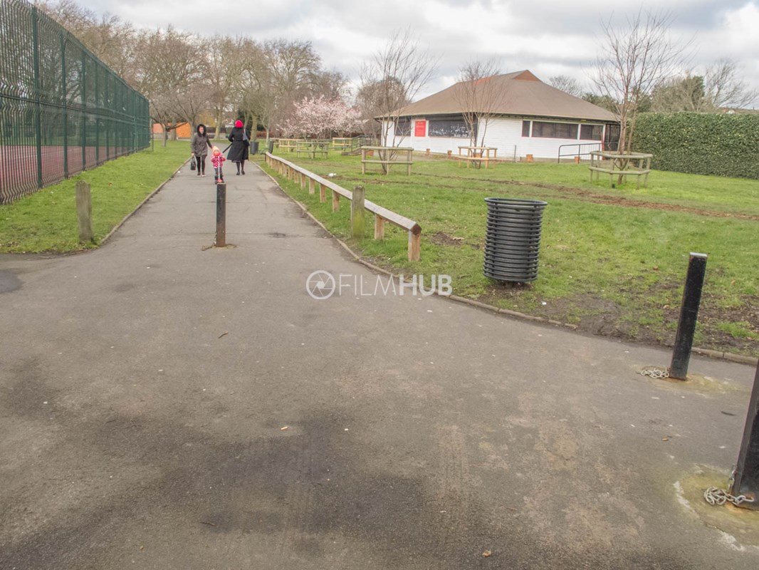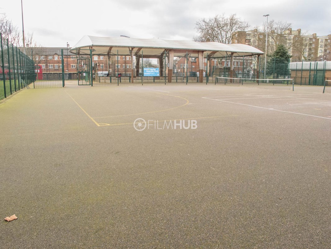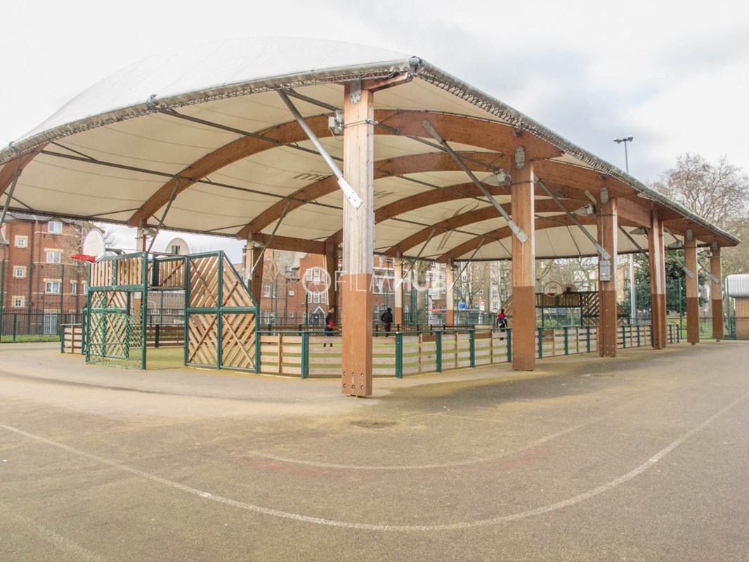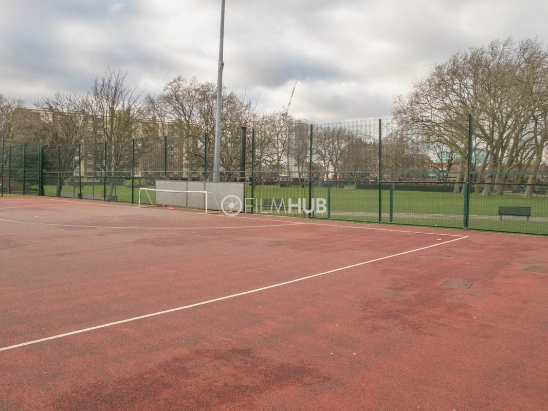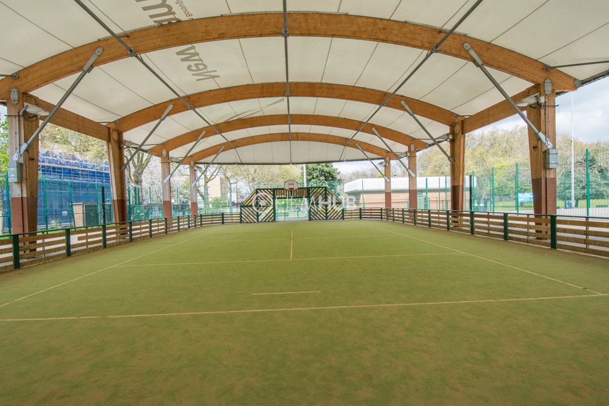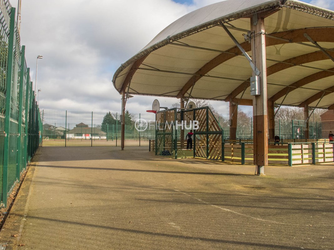 Stratford Park is a large park that is fenced by traditional, black, metal railings with prominent gate pillars at the entrances to the park. The park offers a variety of activities - there is a bowling green that comes with an out building, a basketball court, floodlit 5-a-side football pitch with an all weather surface and canopy, a floodlit multi-use games court, a floodlit tennis court and a normal tennis court.