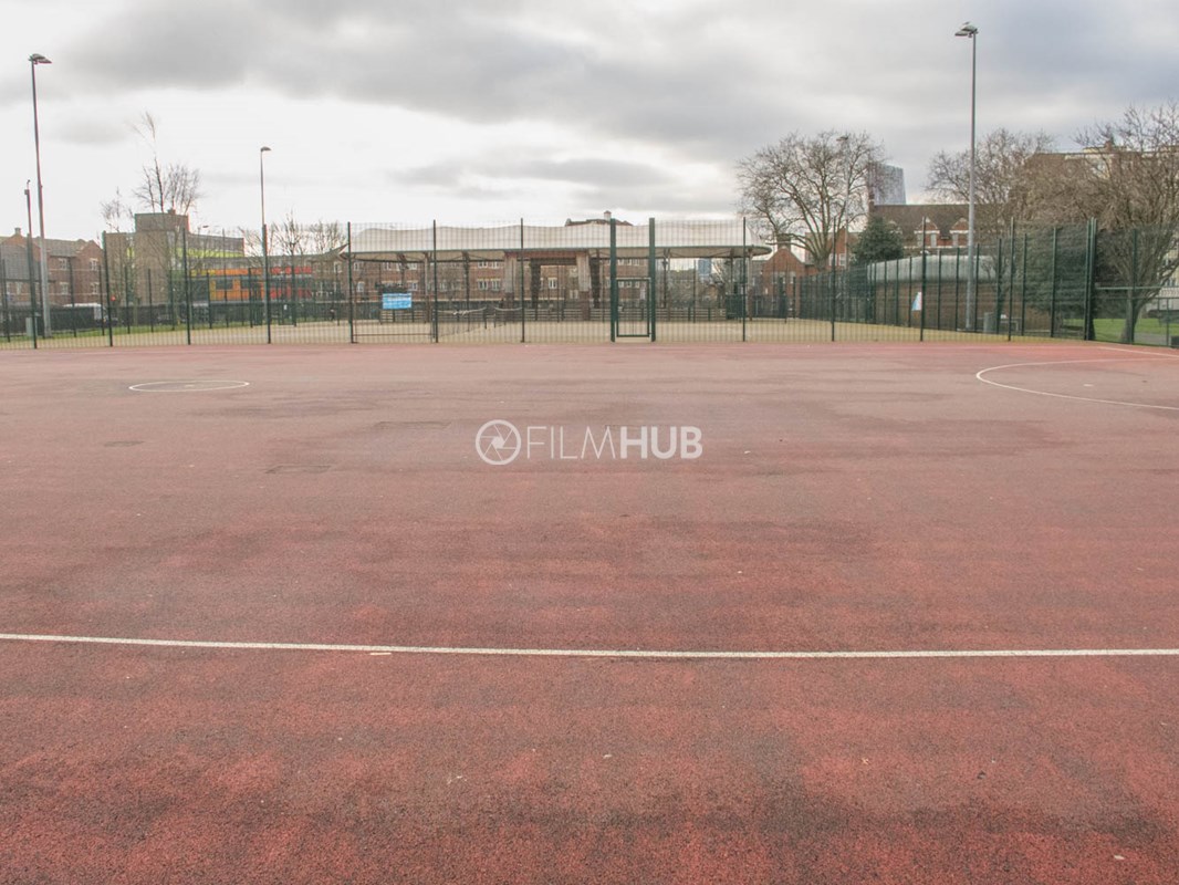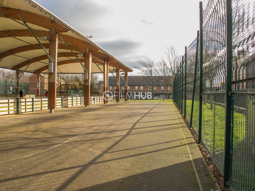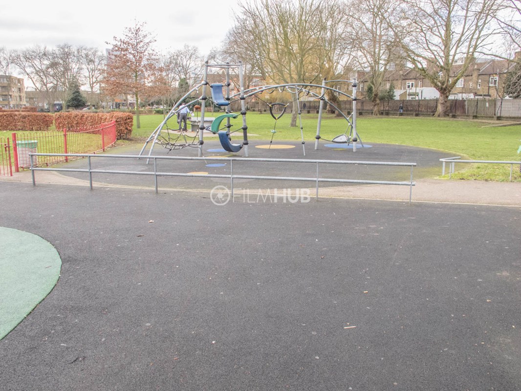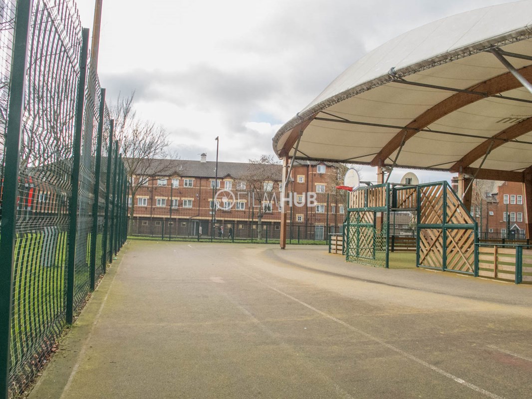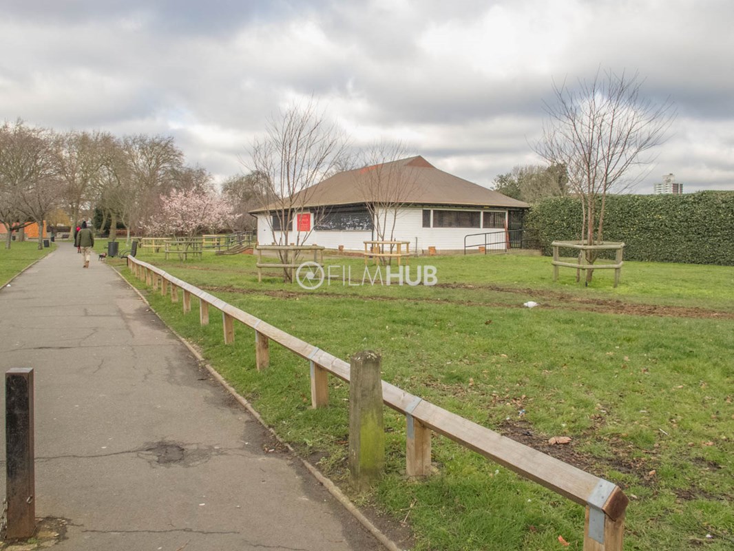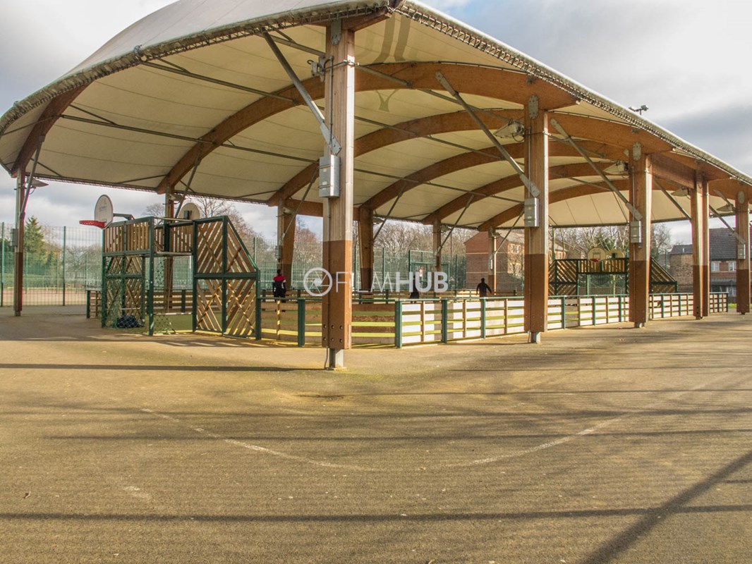 Stratford Park is a large park that is fenced by traditional, black, metal railings with prominent gate pillars at the entrances to the park. The park offers a variety of activities - there is a bowling green that comes with an out building, a basketball court, floodlit 5-a-side football pitch with an all weather surface and canopy, a floodlit multi-use games court, a floodlit tennis court and a normal tennis court.