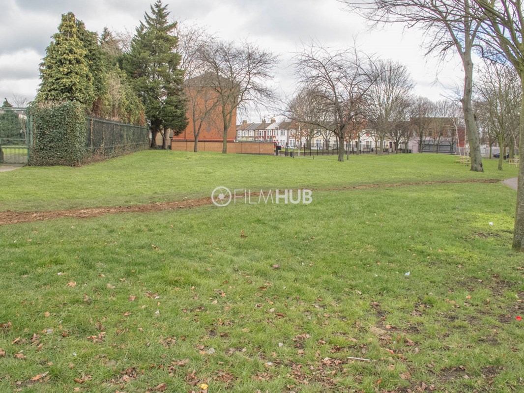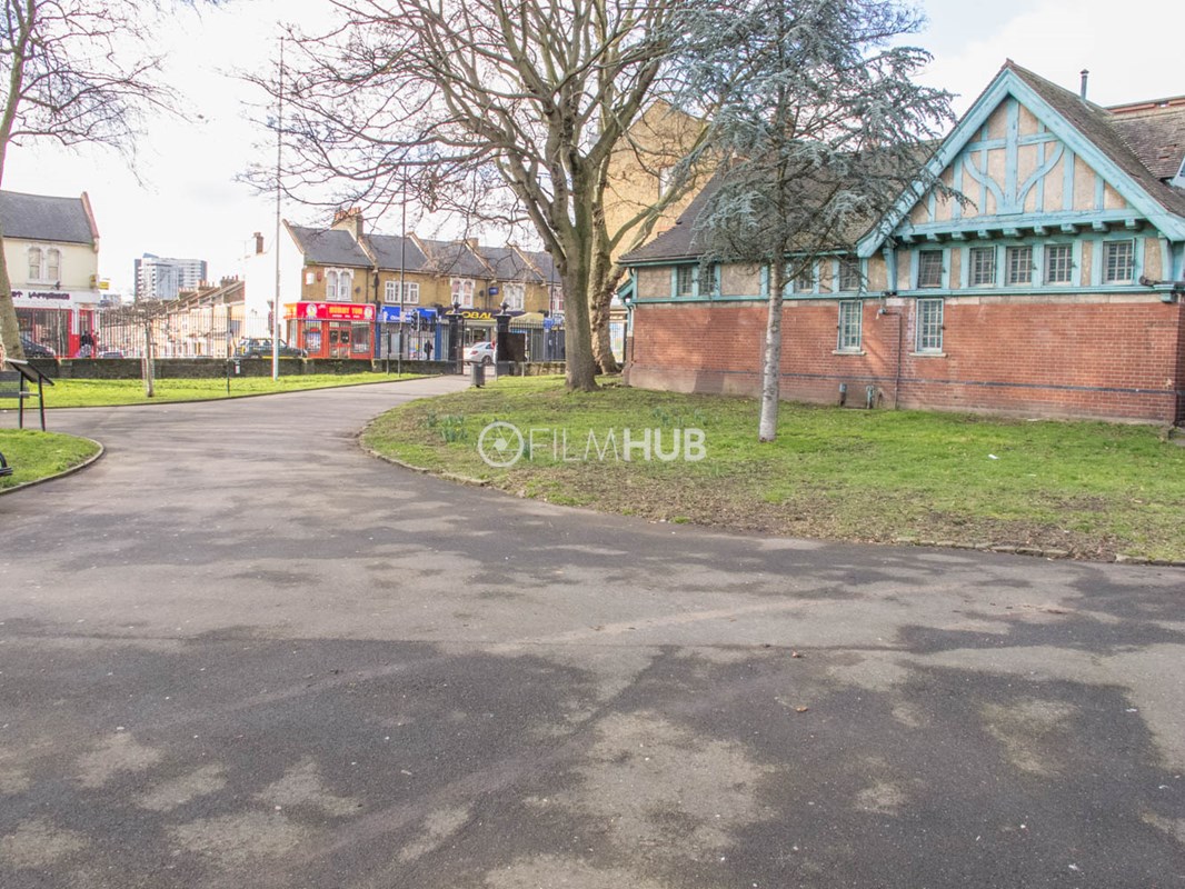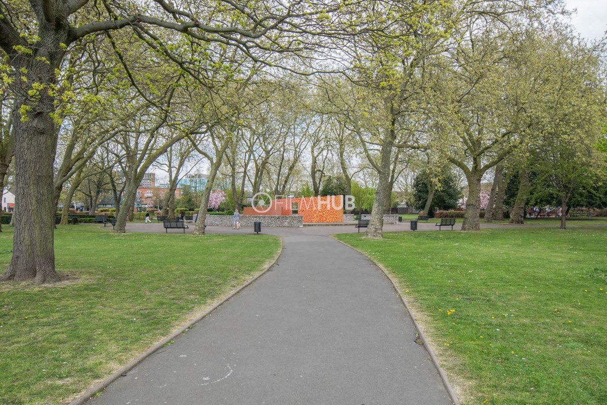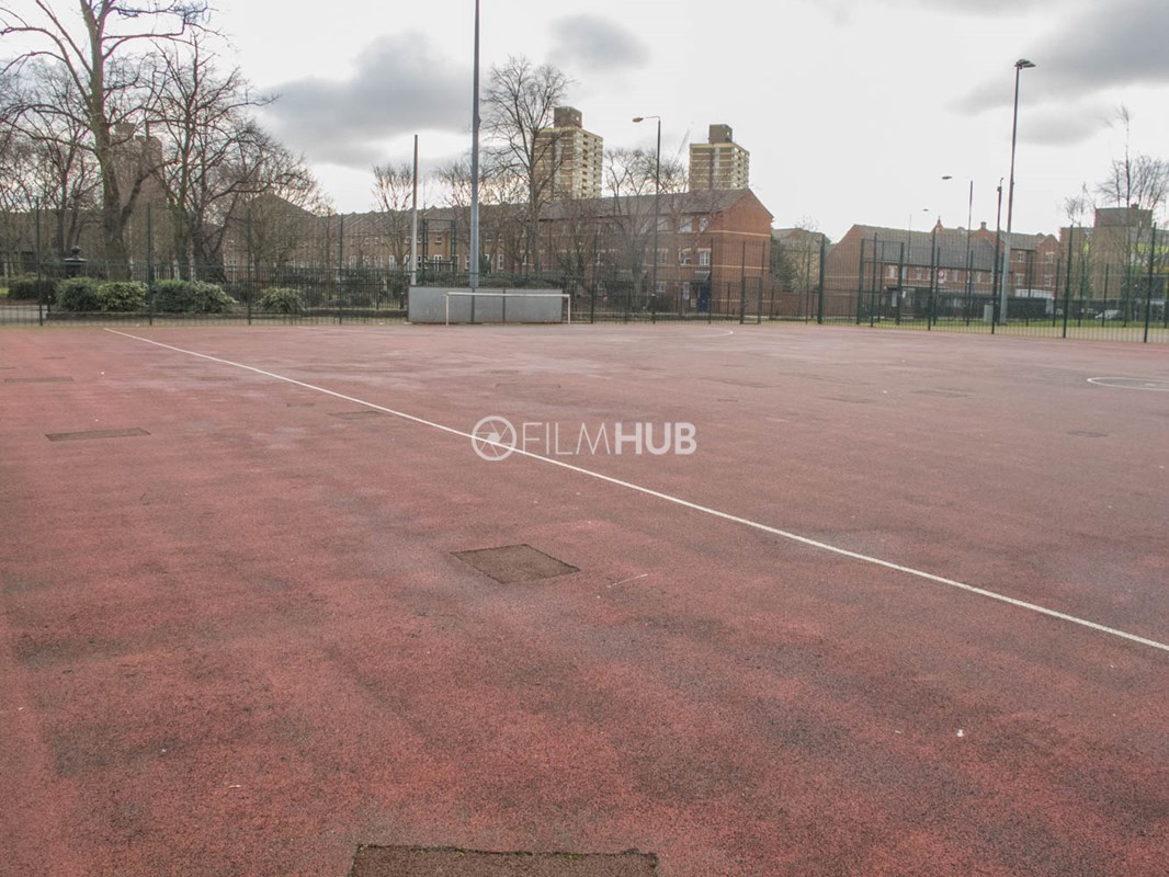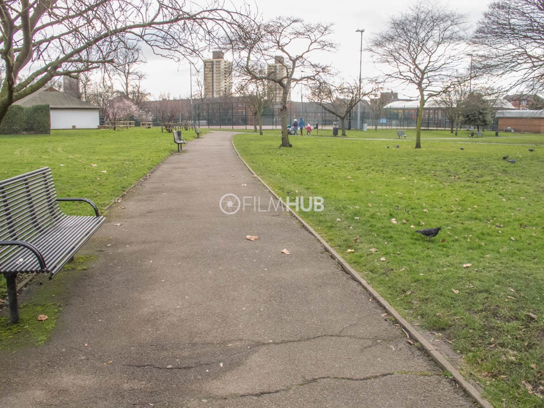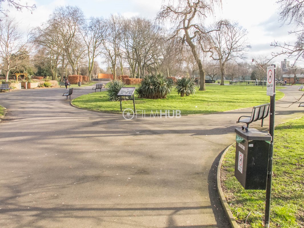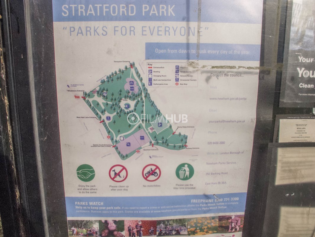 Stratford Park is a large park that is fenced by traditional, black, metal railings with prominent gate pillars at the entrances to the park. The park offers a variety of activities - there is a bowling green that comes with an out building, a basketball court, floodlit 5-a-side football pitch with an all weather surface and canopy, a floodlit multi-use games court, a floodlit tennis court and a normal tennis court.
