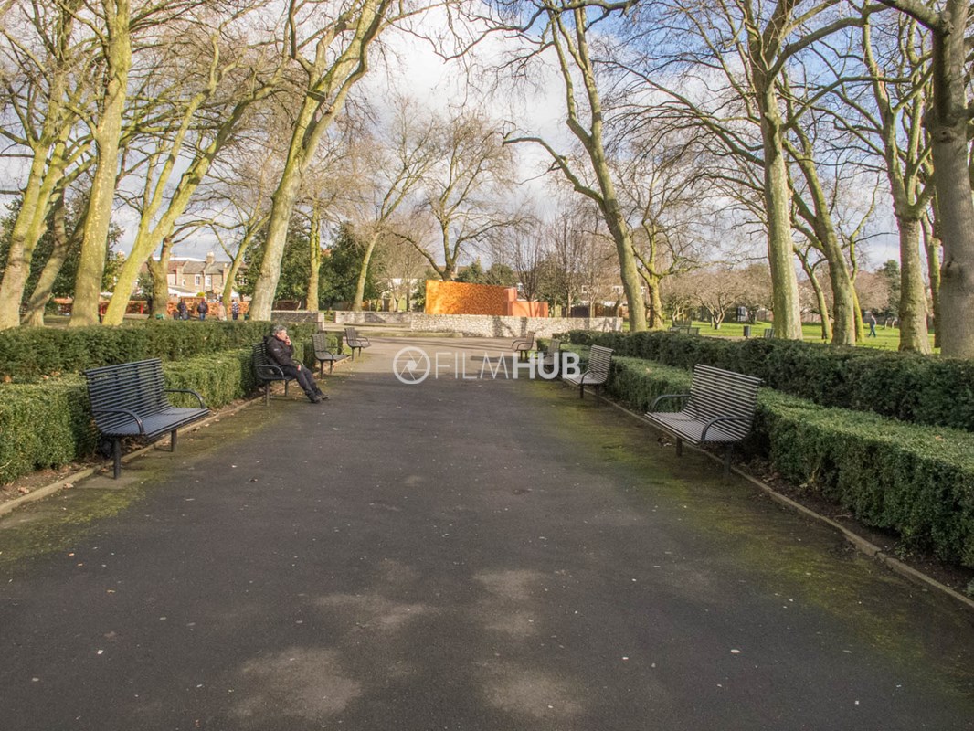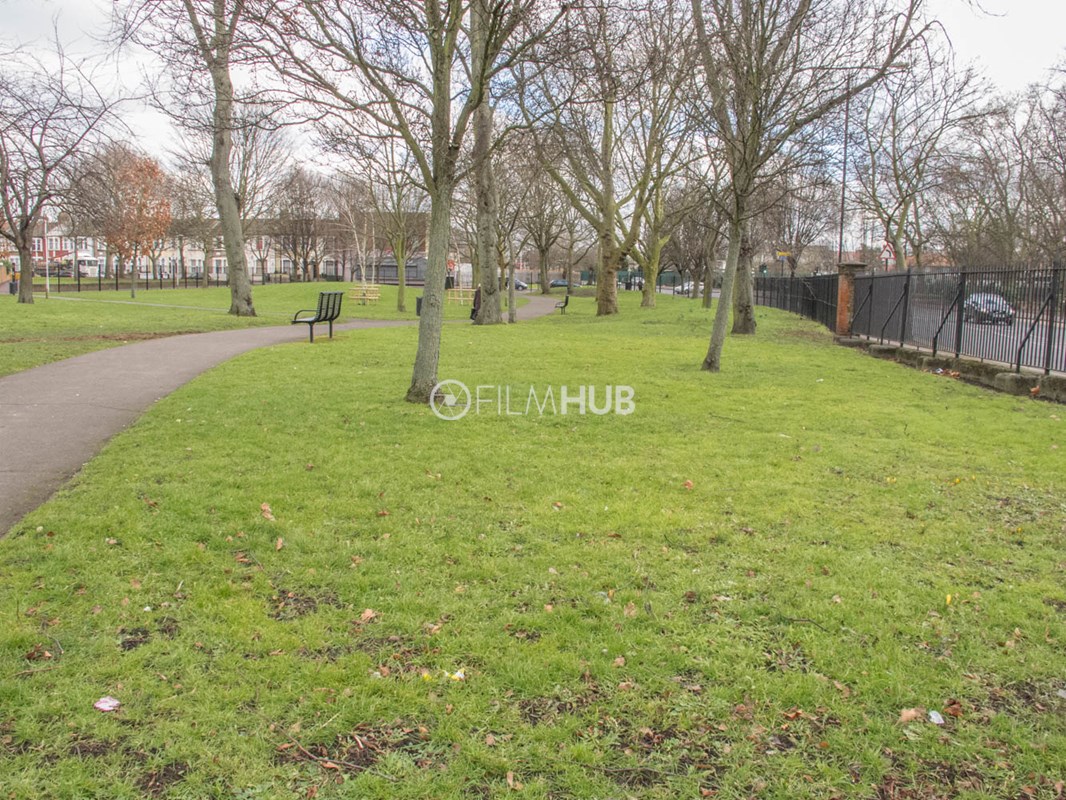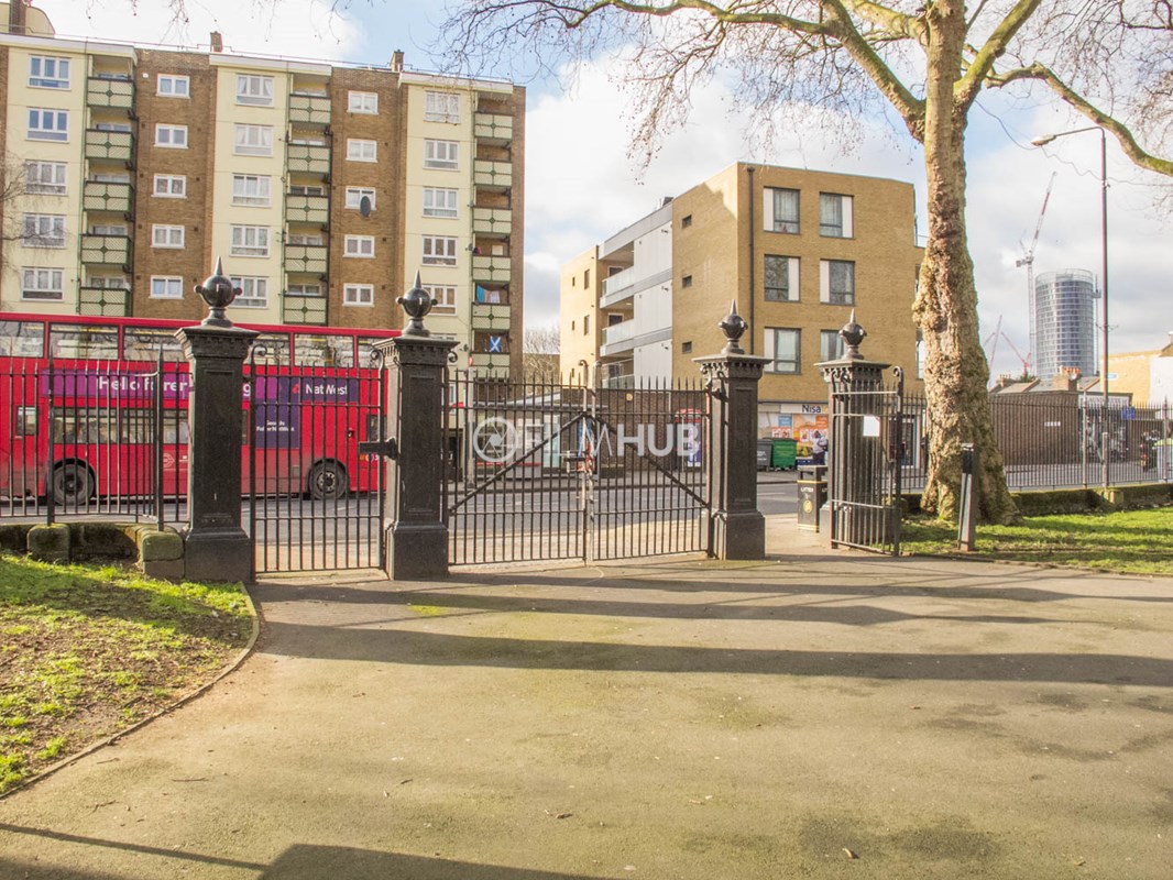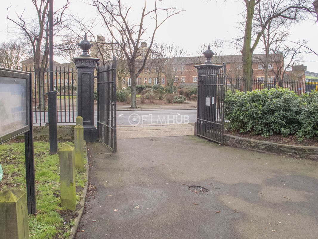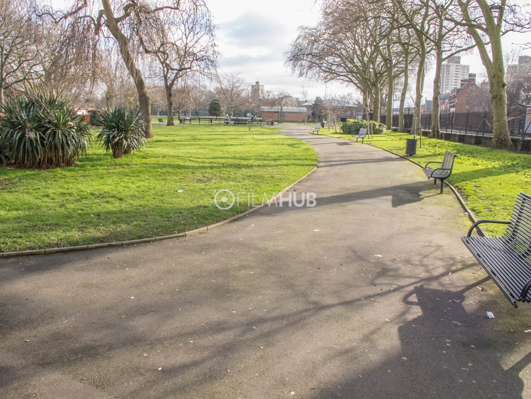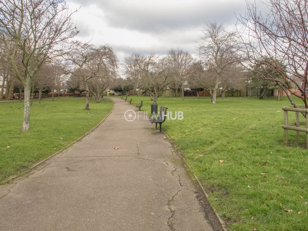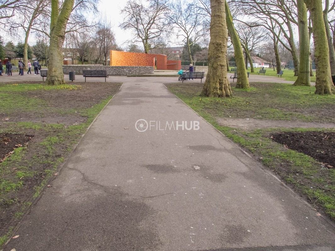Stratford Park is a large park that is fenced by traditional, black, metal railings with prominent gate pillars at the entrances to the park. The park offers a variety of activities - there is a bowling green that comes with an out building, a basketball court, floodlit 5-a-side football pitch with an all weather surface and canopy, a floodlit multi-use games court, a floodlit tennis court and a normal tennis court.