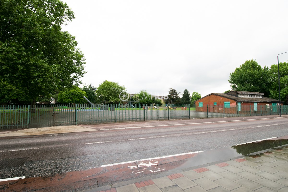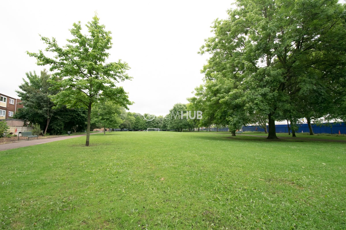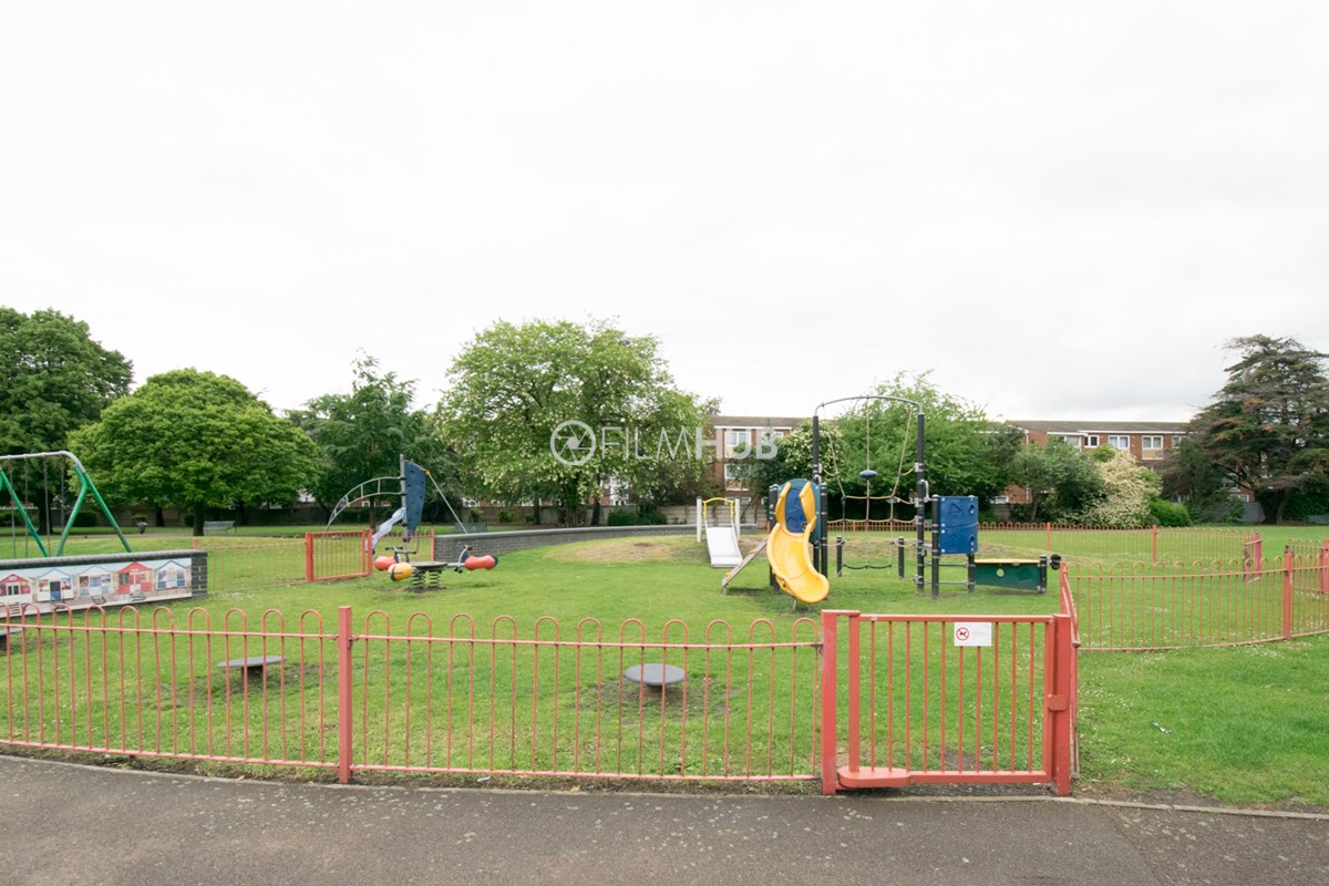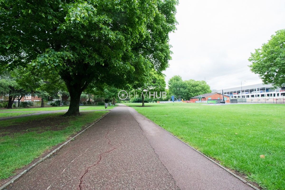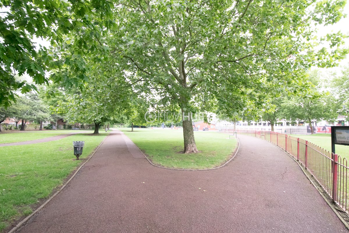 The park offers tree-lined paths, wide open spaces and a large play area featuring swings and slides.
