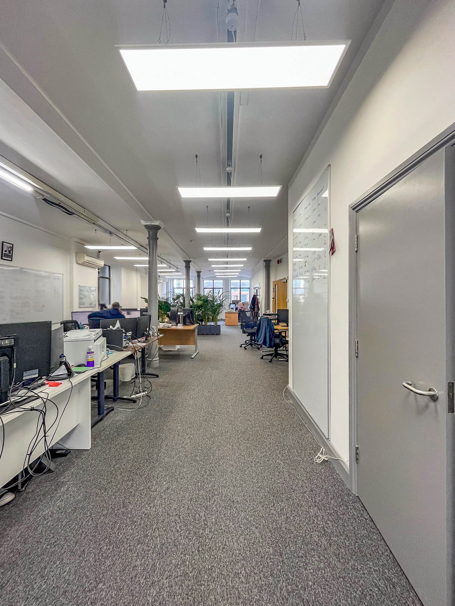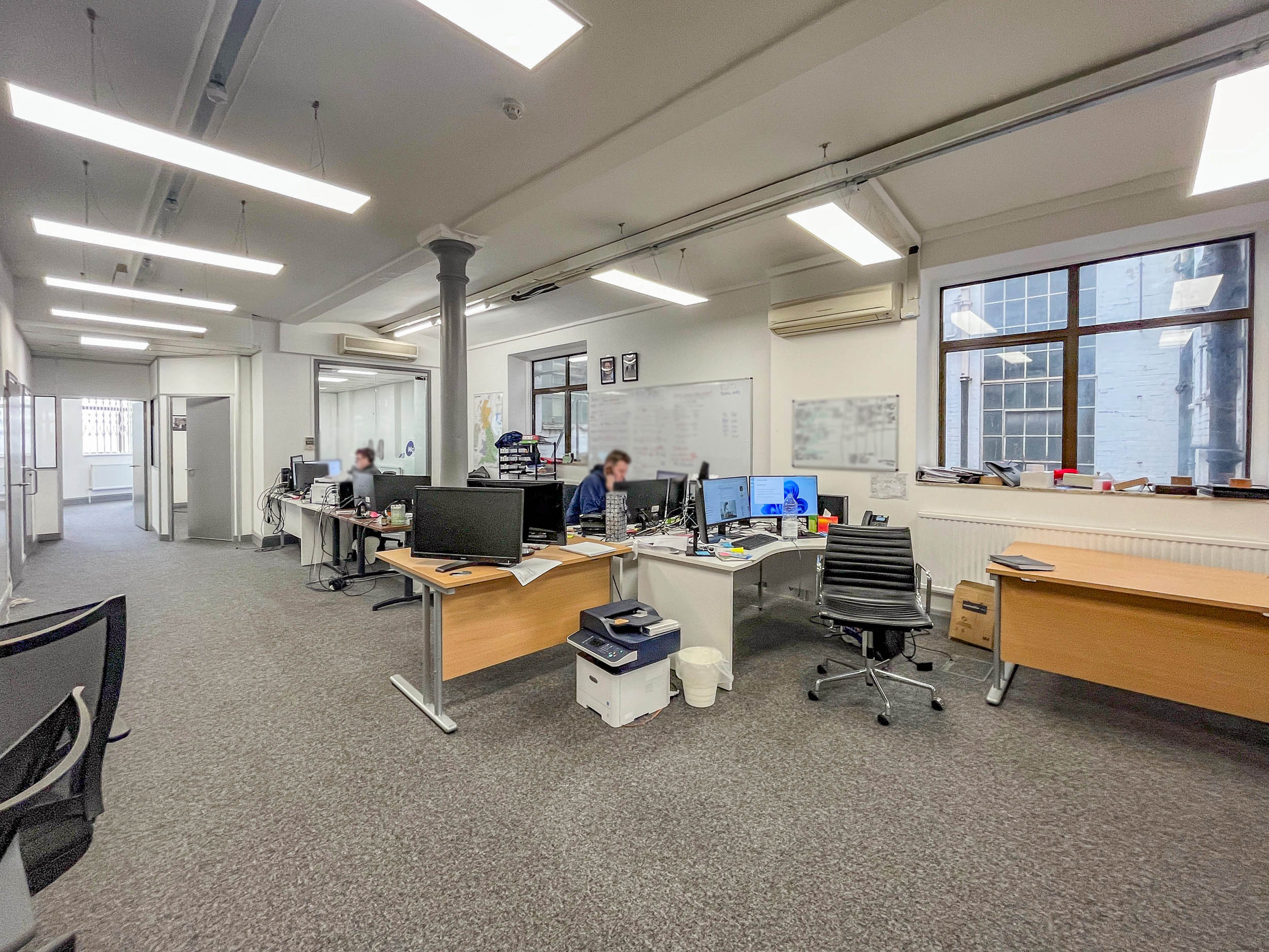This office building has 2 floors of shared work space and a meeting room. Its large windows and open plan enable natural light throughout the building.