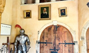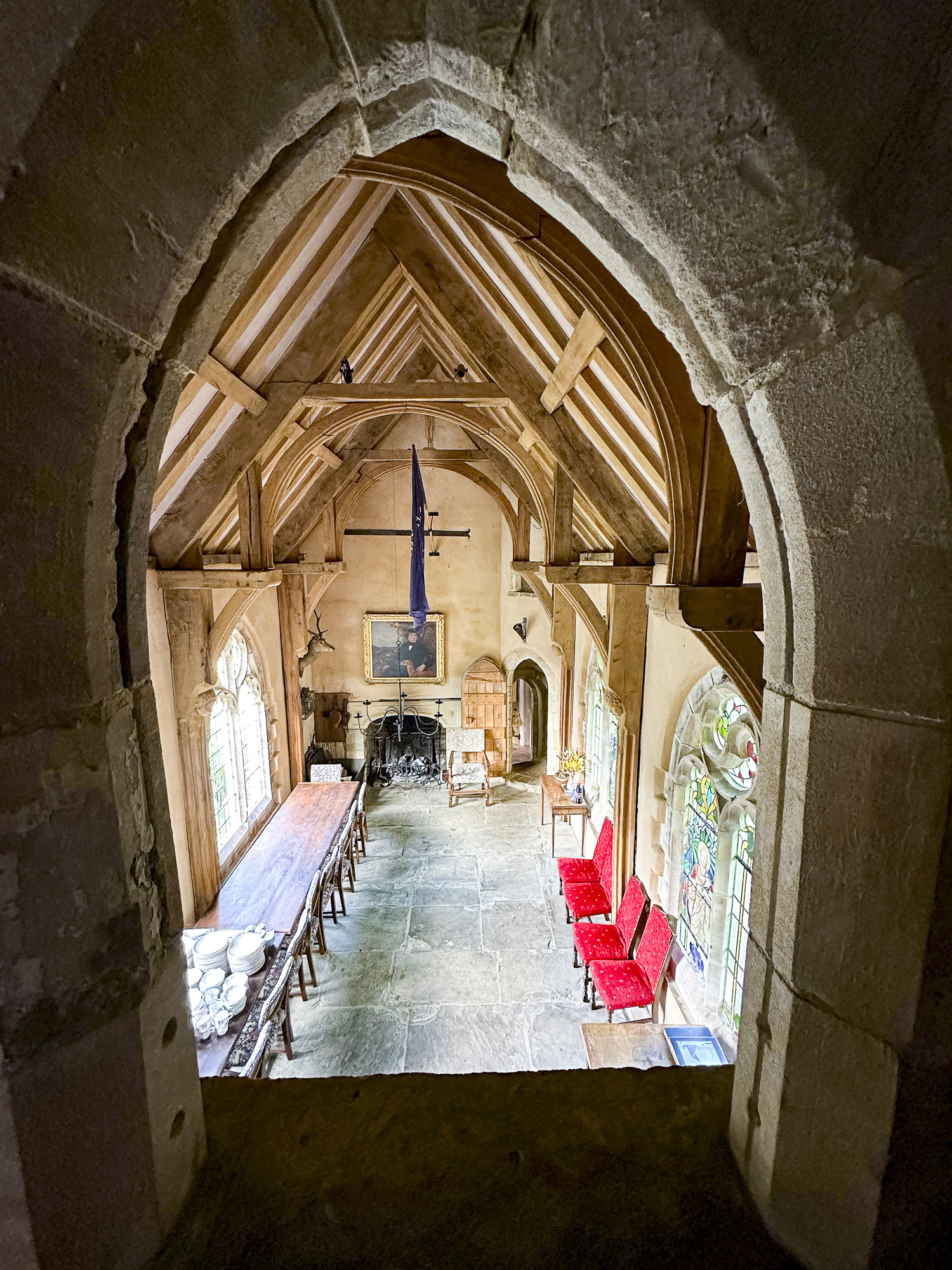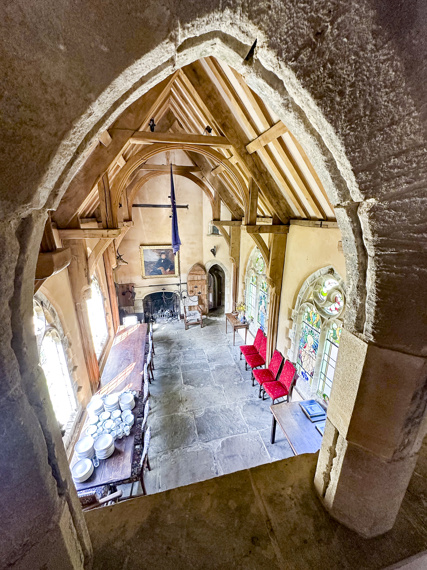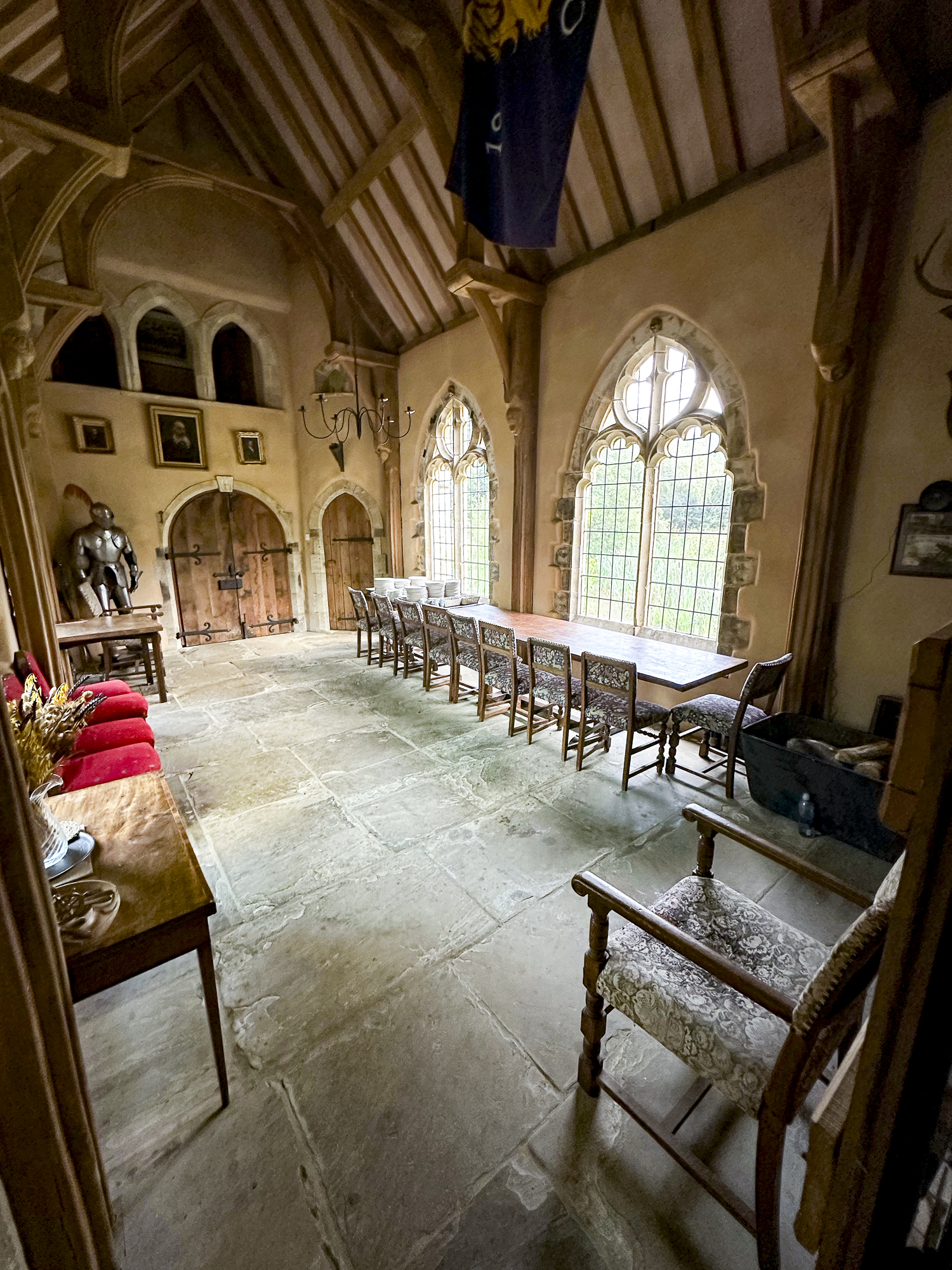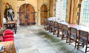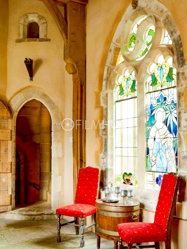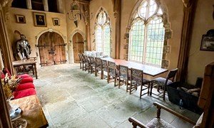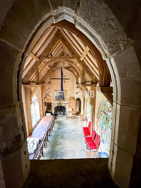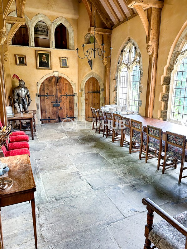 Inside, a vaulted banqueting hall sits alongside flagstone floors, stone spiral staircases and open fireplaces. Period details include beamed ceilings and walls, stained-glass windows, suits of armour, mounted stag heads and historic paintings.