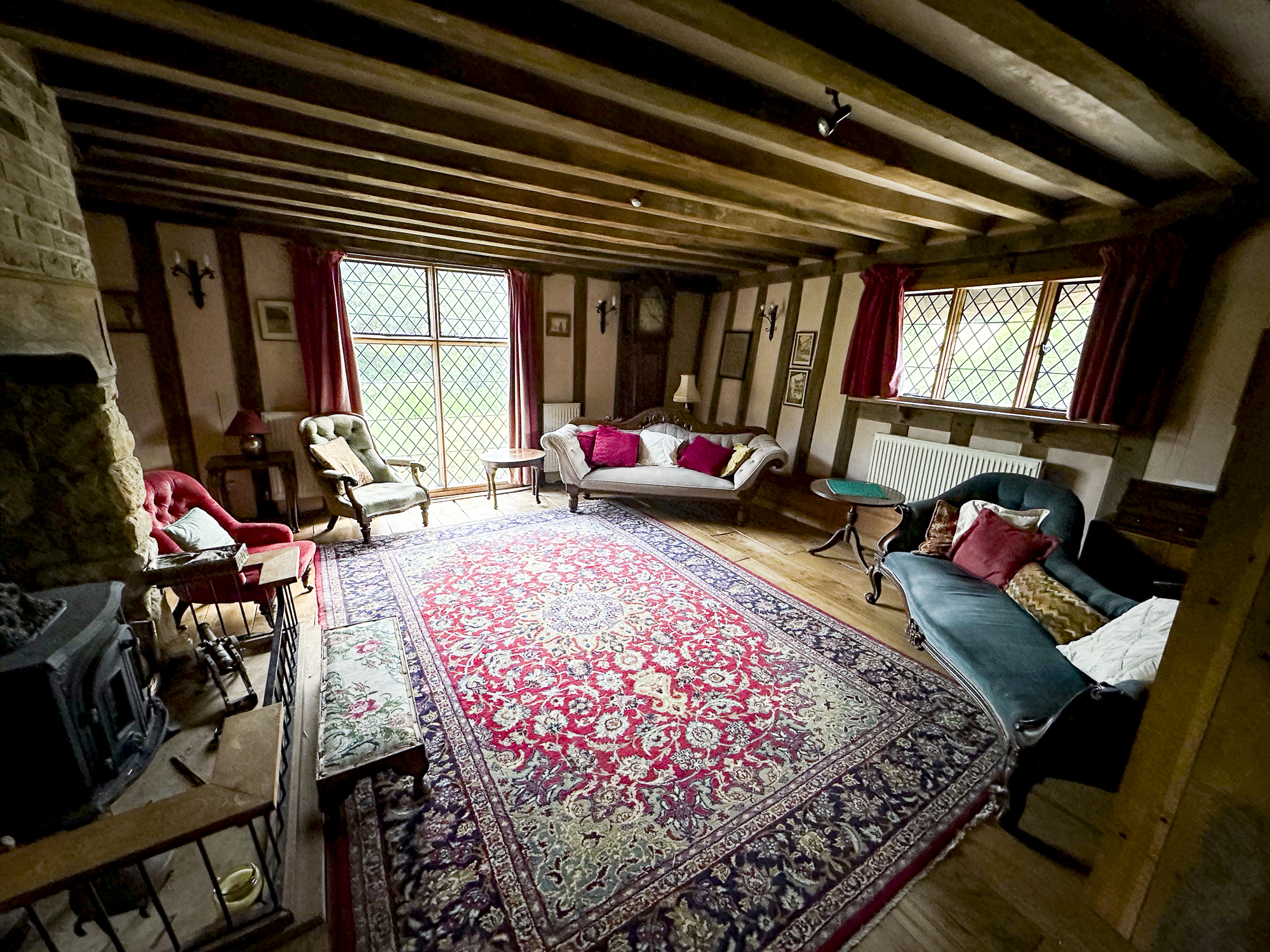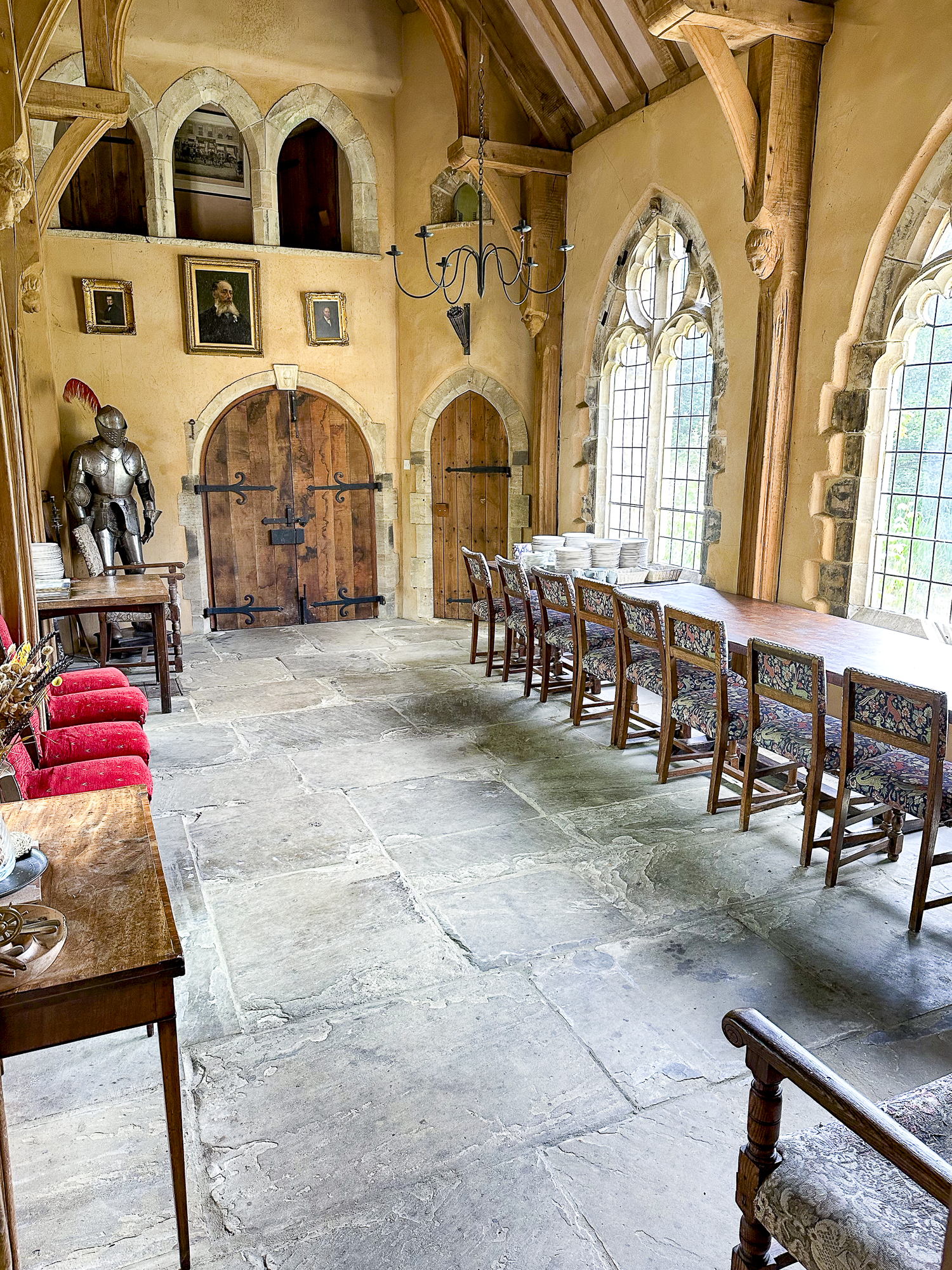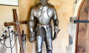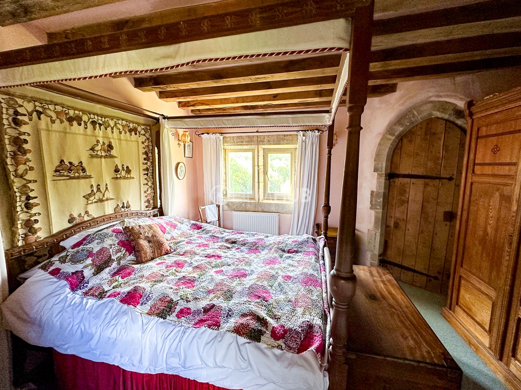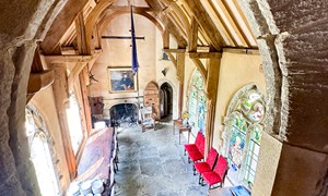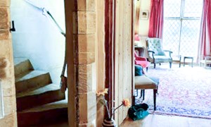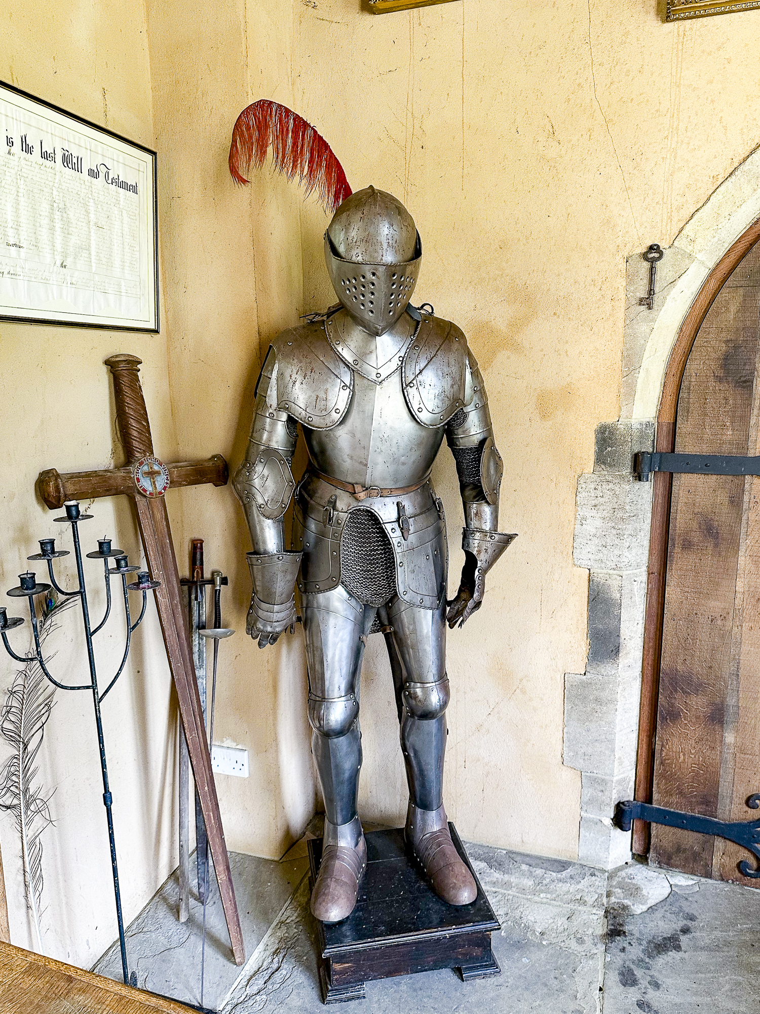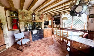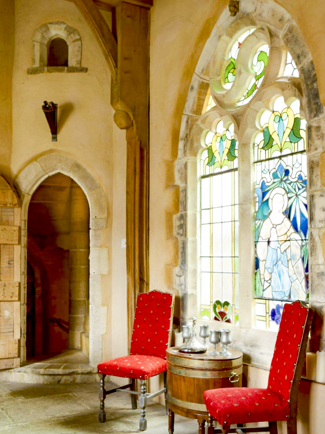 Inside, a vaulted banqueting hall sits alongside flagstone floors, stone spiral staircases and open fireplaces. Period details include beamed ceilings and walls, stained-glass windows, suits of armour, mounted stag heads and historic paintings.