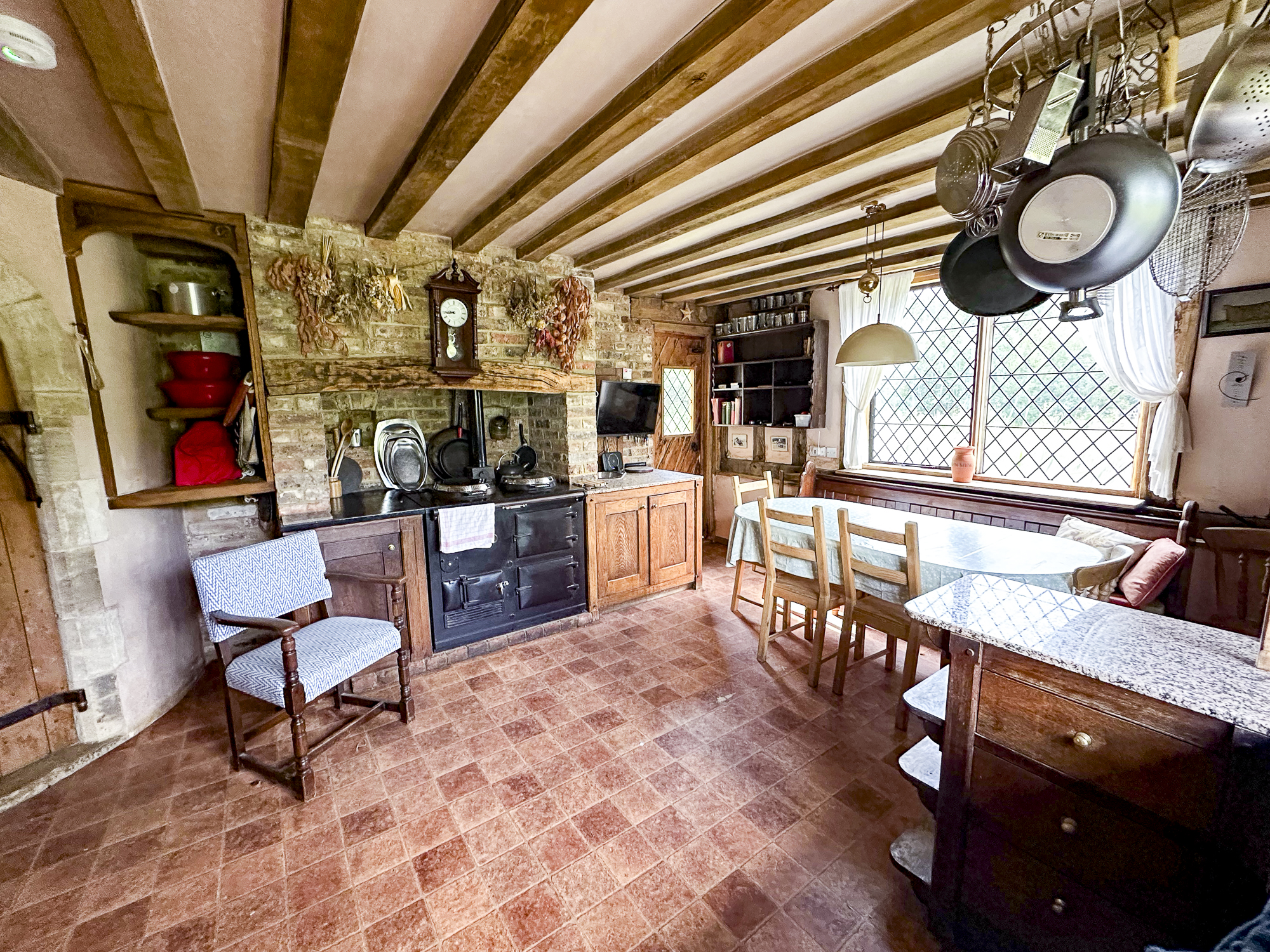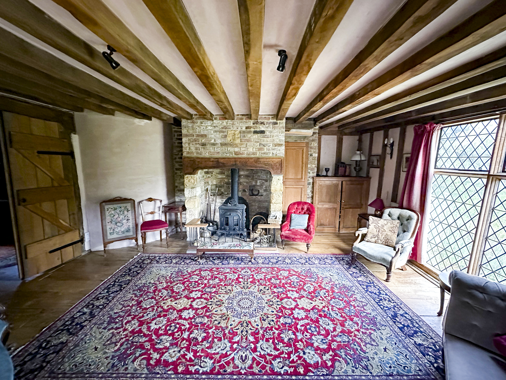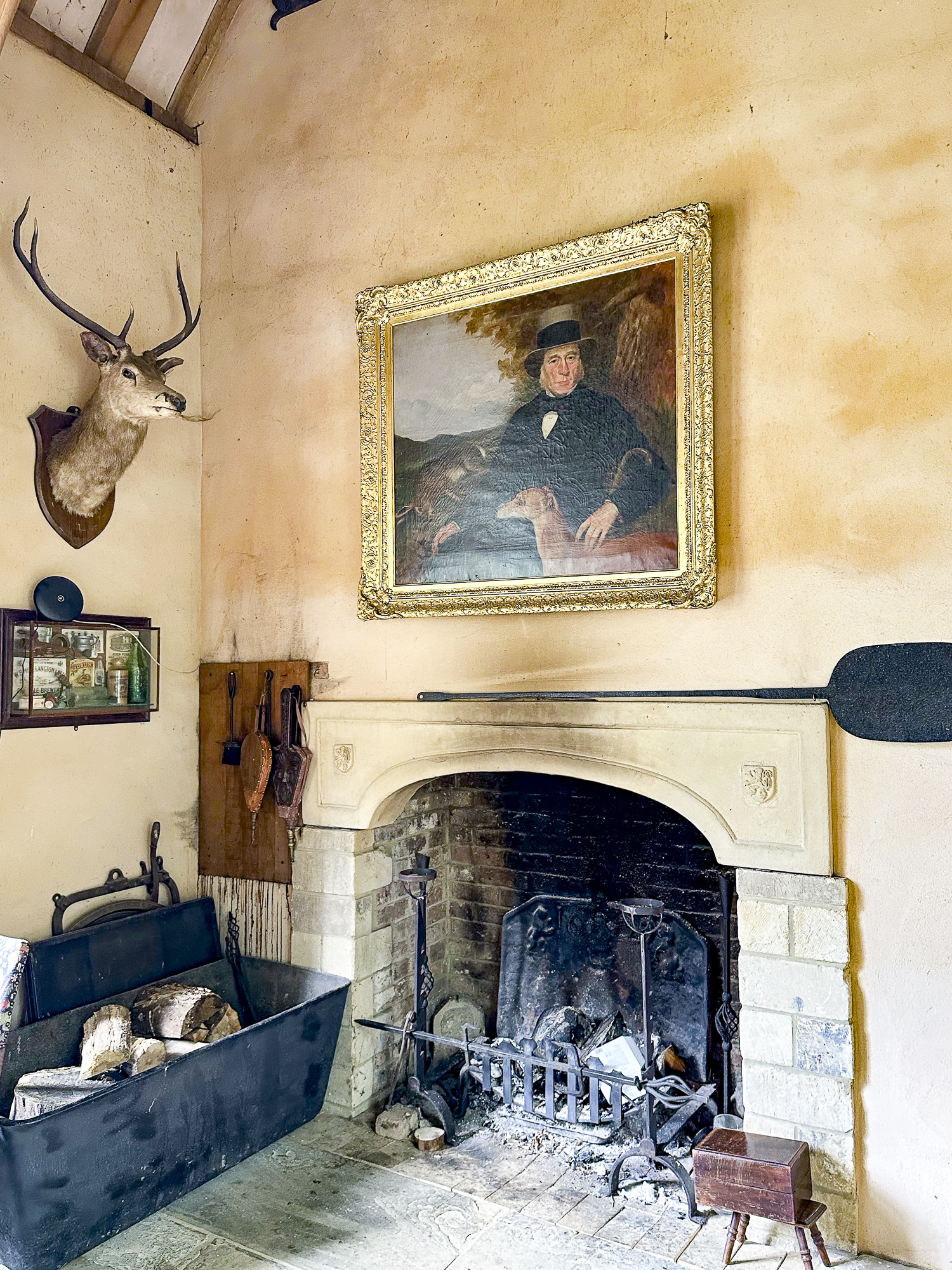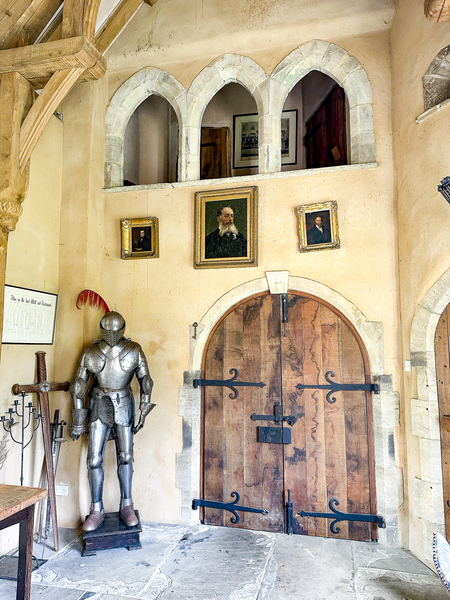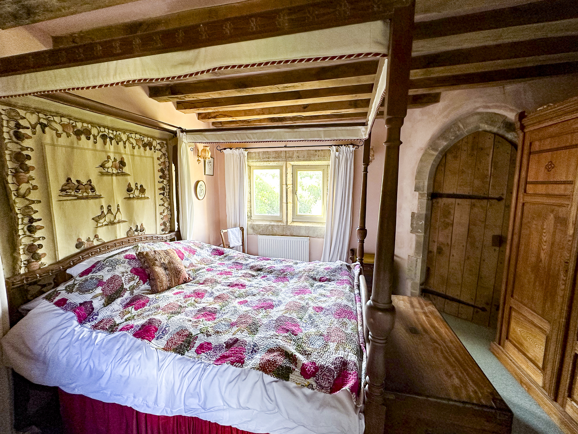Inside, a vaulted banqueting hall sits alongside flagstone floors, stone spiral staircases and open fireplaces. Period details include beamed ceilings and walls, stained-glass windows, suits of armour, mounted stag heads and historic paintings.