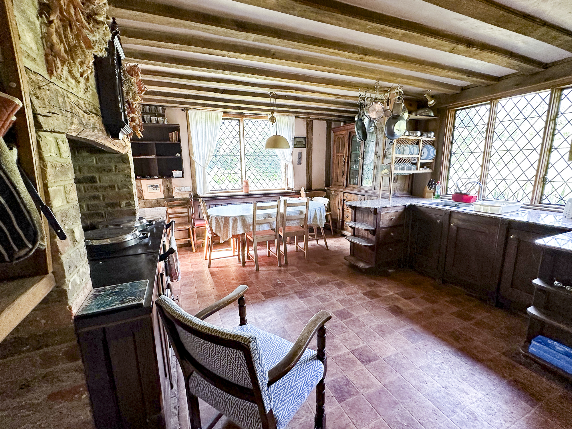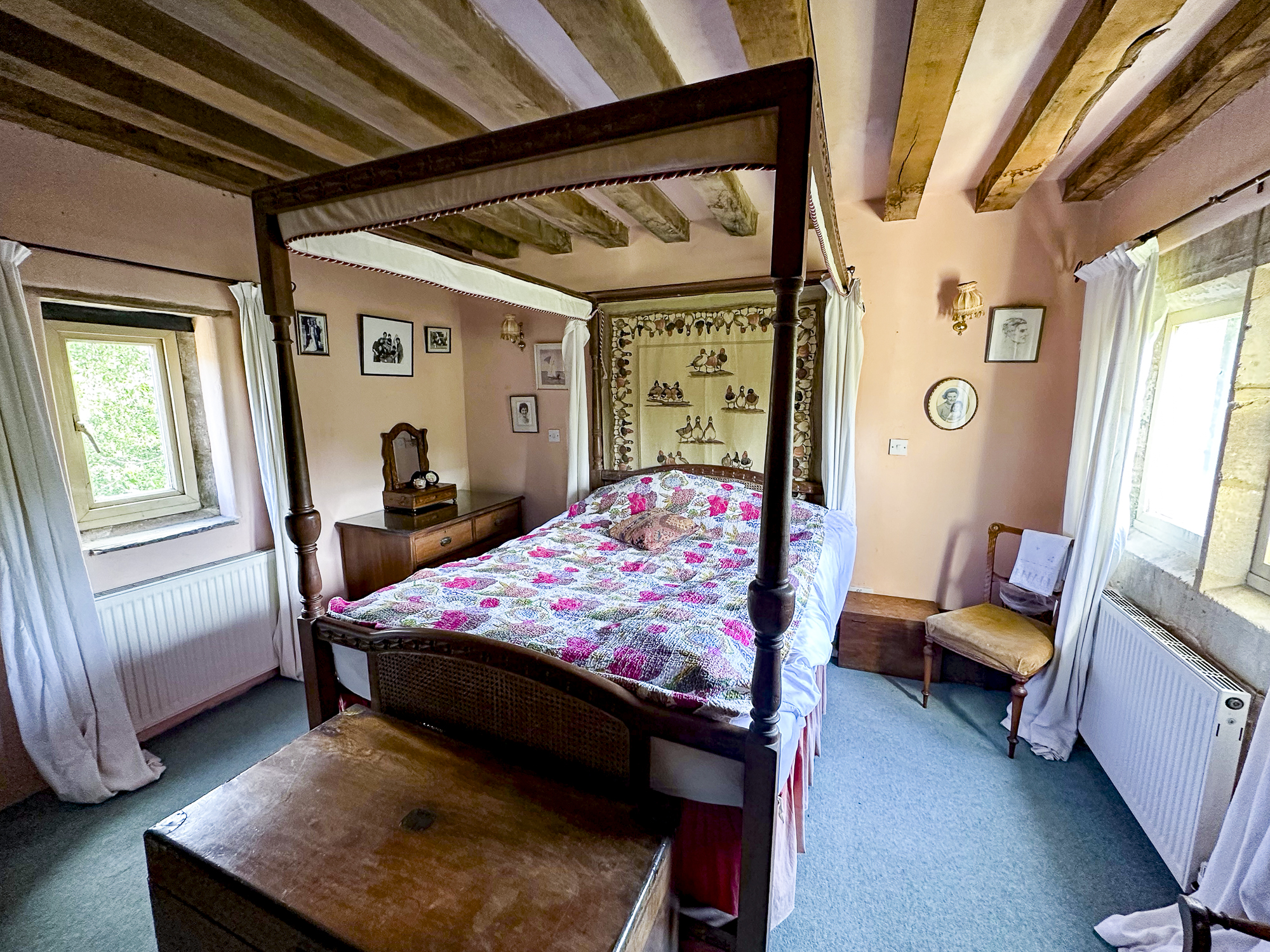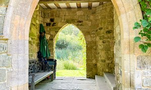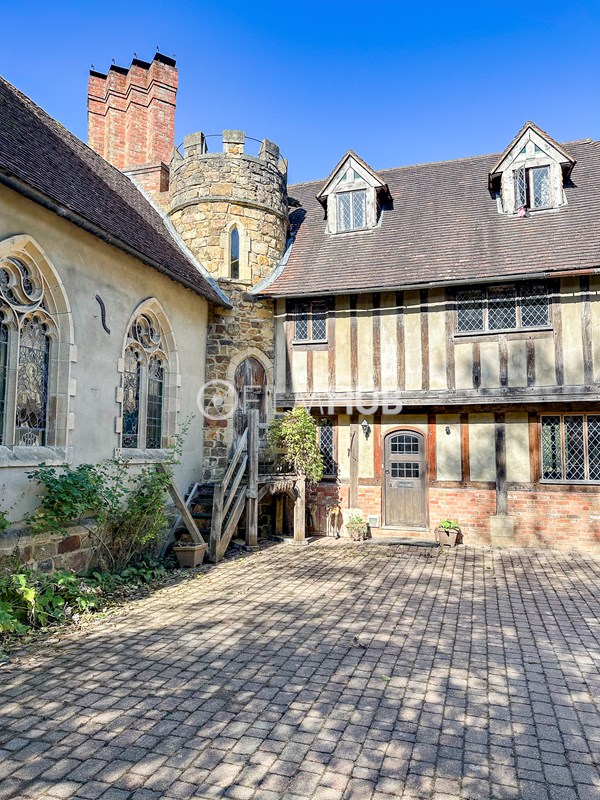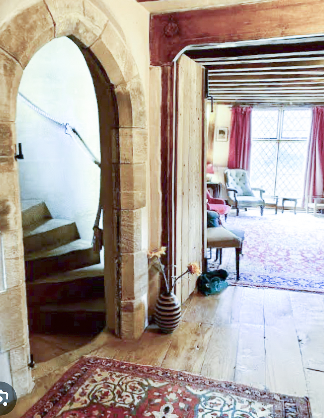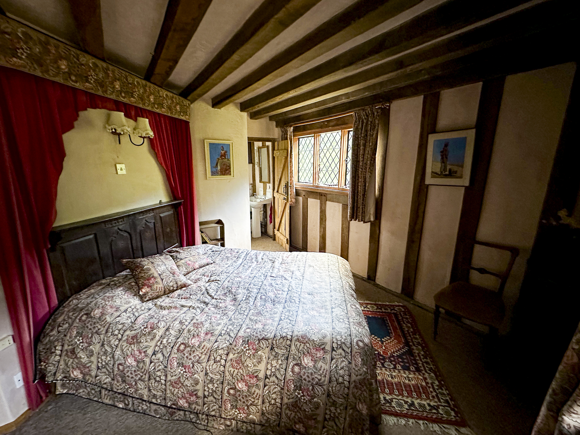 Inside, a vaulted banqueting hall sits alongside flagstone floors, stone spiral staircases and open fireplaces. Period details include beamed ceilings and walls, stained-glass windows, suits of armour, mounted stag heads and historic paintings.