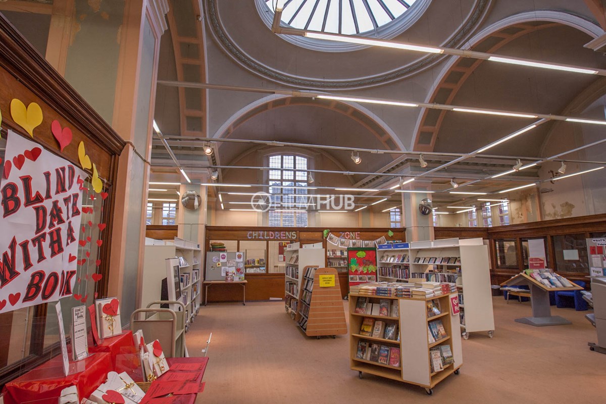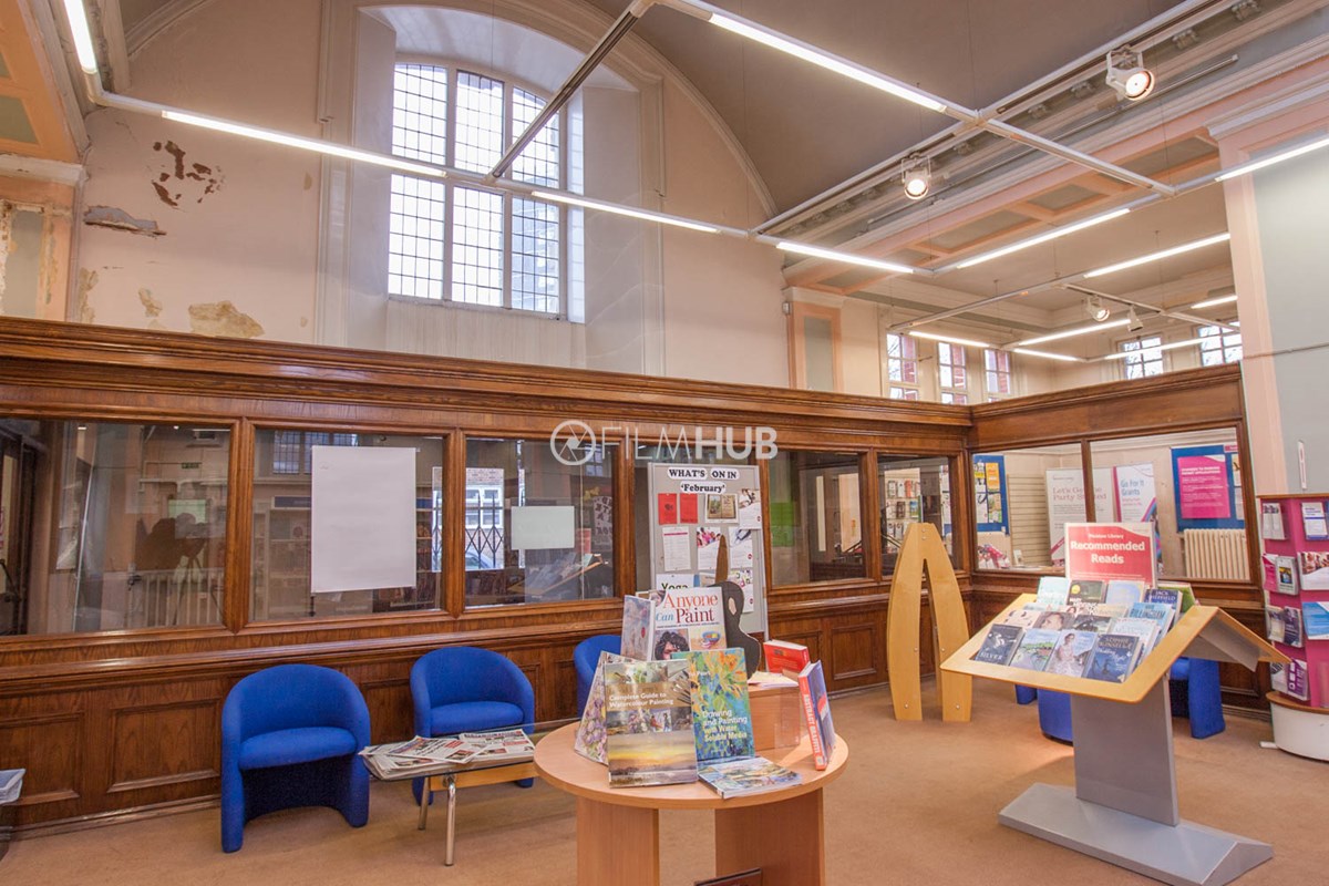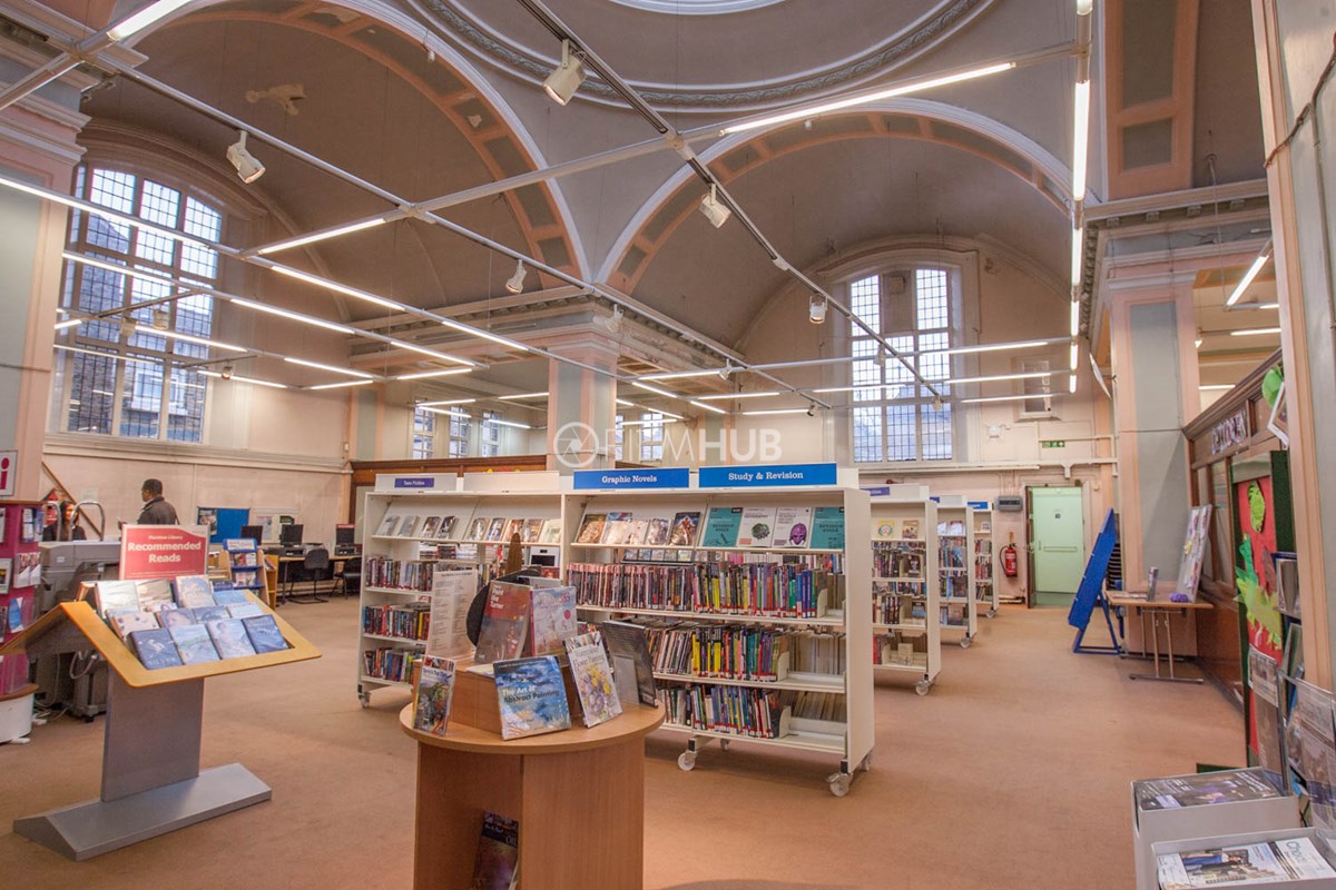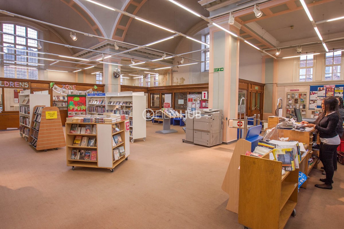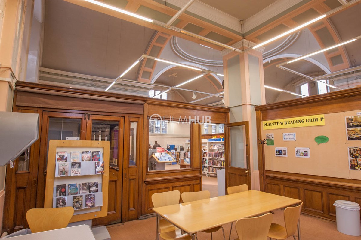 Plaistow Library is an impressive library with high ceilings, wooden partition sections to create separate study rooms and it also features a gorgeous glass dome window at the centre of the library that allows the flow of natural light. The library is light and airy, with its white open bricked walls, large ceiling high windows and spacious layout. The library also provides space for children's reading areas and quiet study rooms.