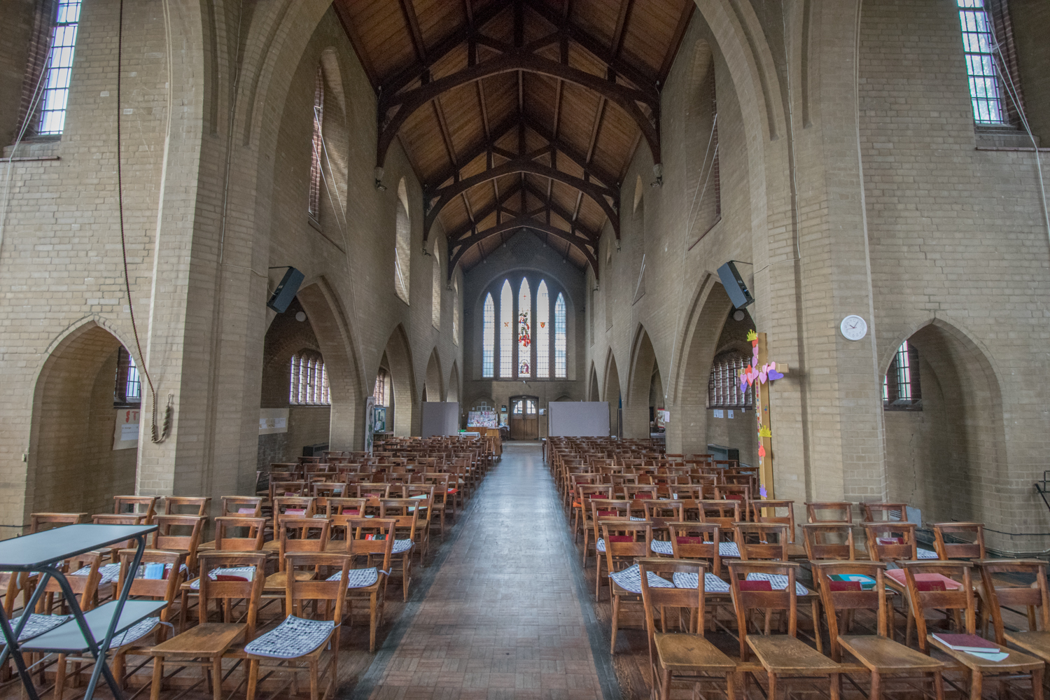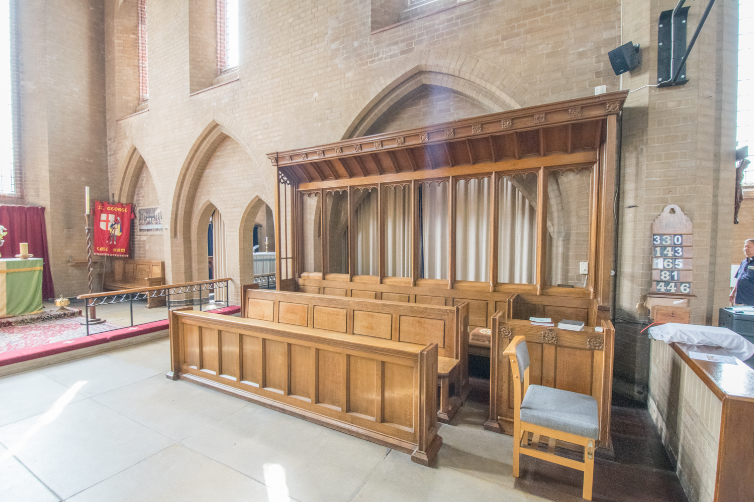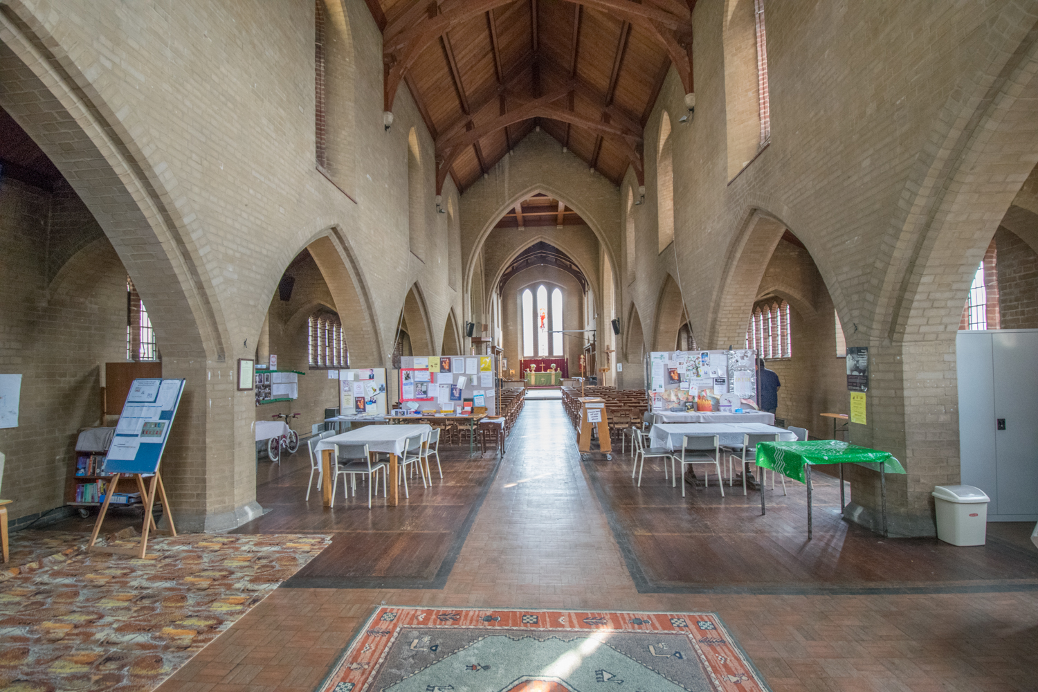 The Church's white brick columns & walls with large stained glass windows make for a very light and vibrant interior.