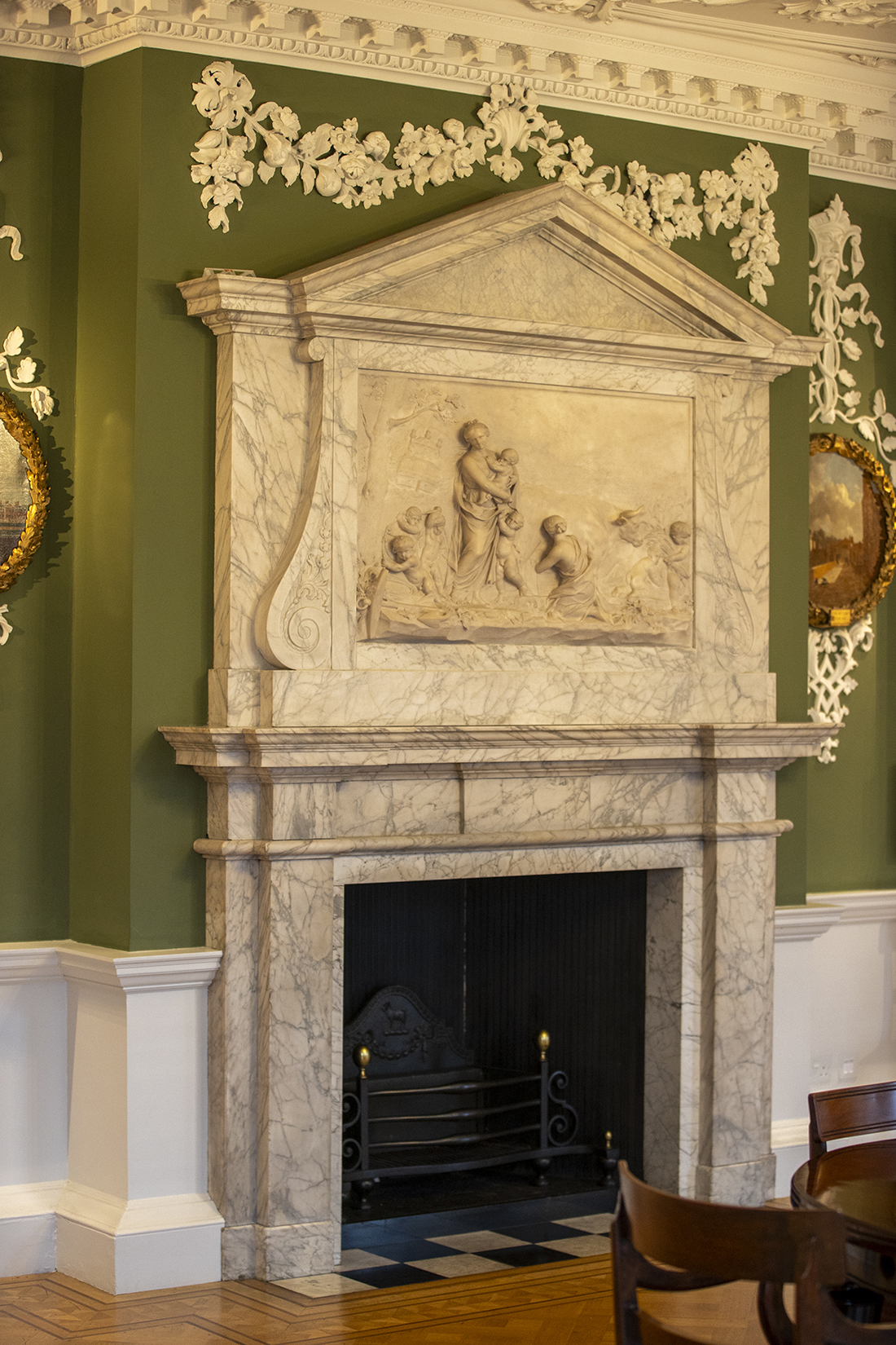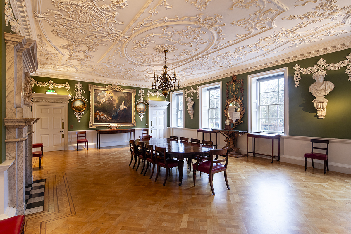 Features include decorative plaster ceilings, parquet and other wood flooring, ornate period furniture, a marble fireplace, and displays of artworks and sculpture, plus configurable event and meeting areas.