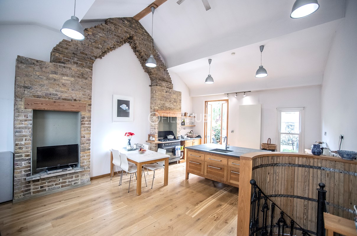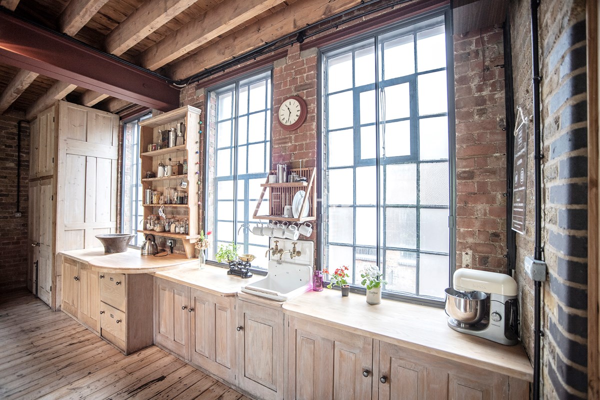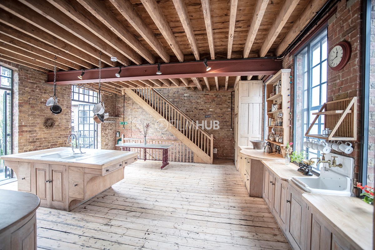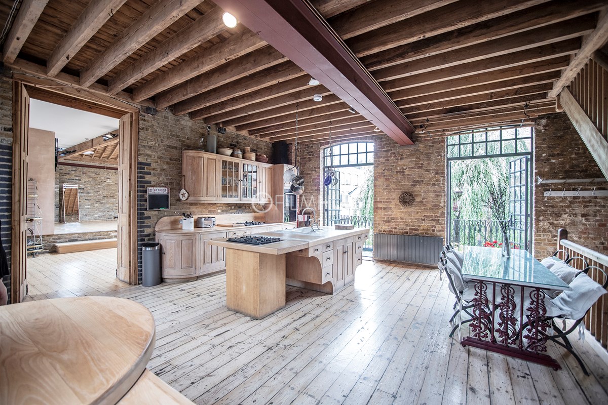 Both the studio space and the main kitchen have high pitched roofs, with exposed Scotts pine roof trusses and sanded wooden floors.