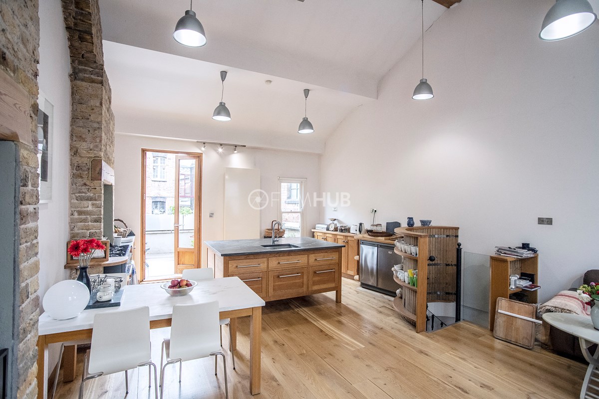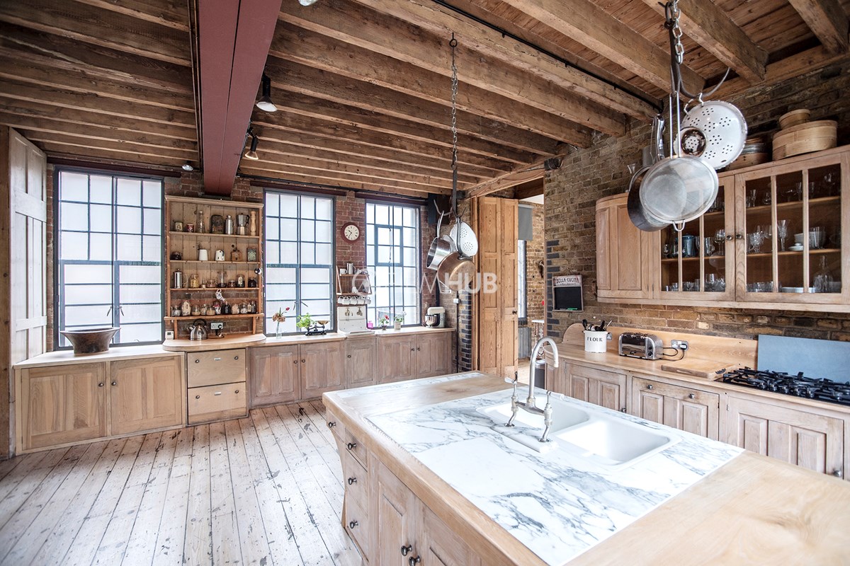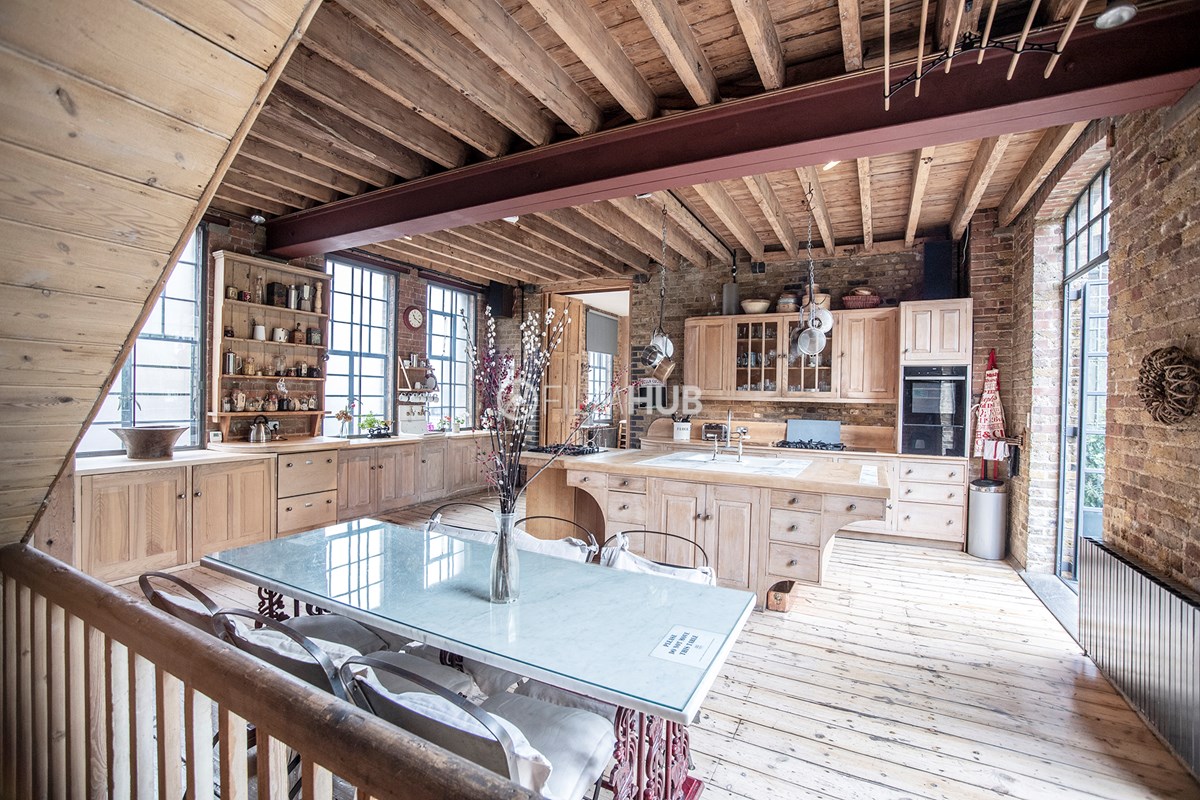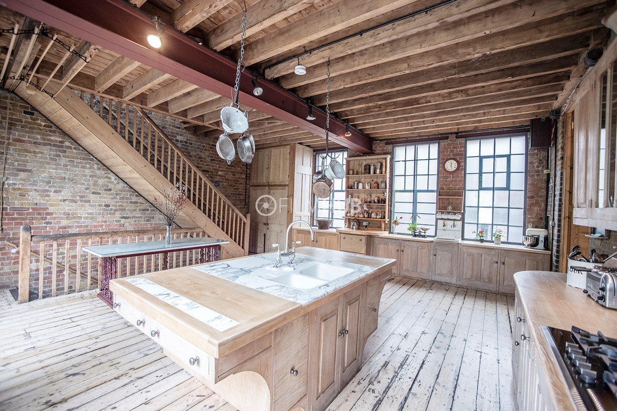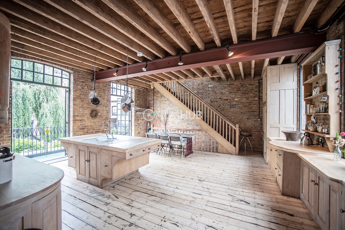 Both the studio space and the main kitchen have high pitched roofs, with exposed Scotts pine roof trusses and sanded wooden floors.