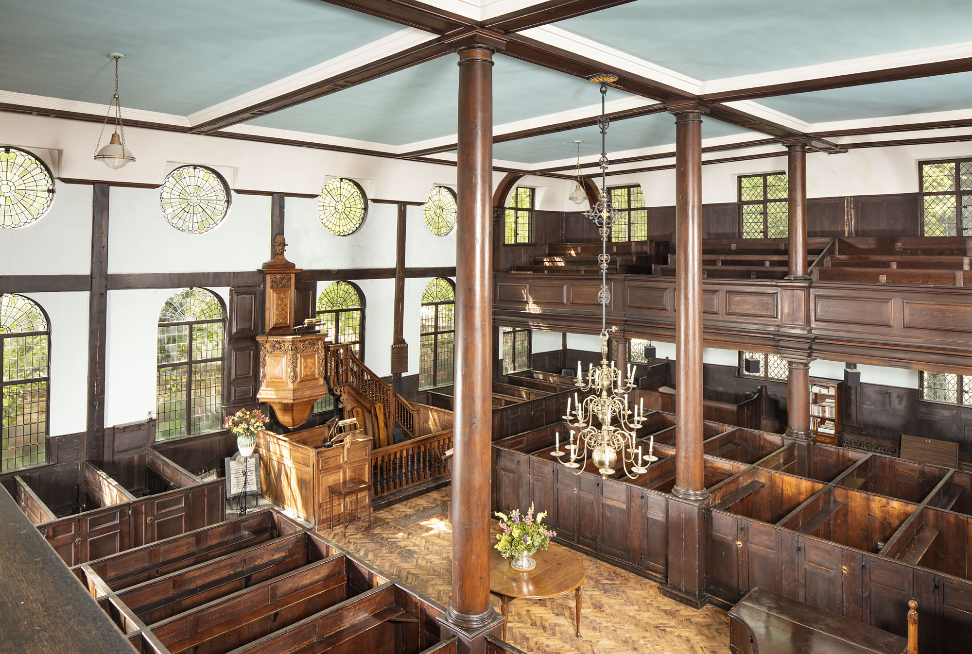This meeting house is Grade I listed and has retained many original features from 1699. It also includes the Grade II listed upper hall that is complete with the original ceiling beams.