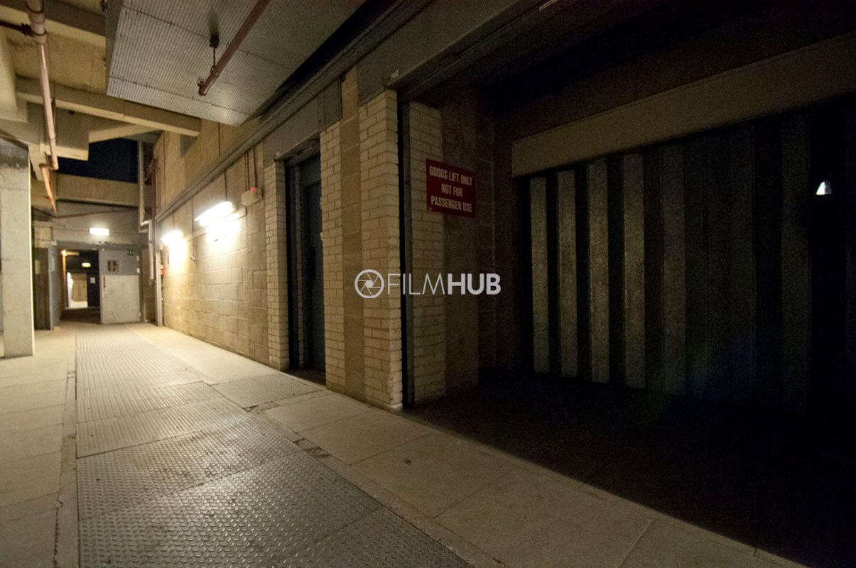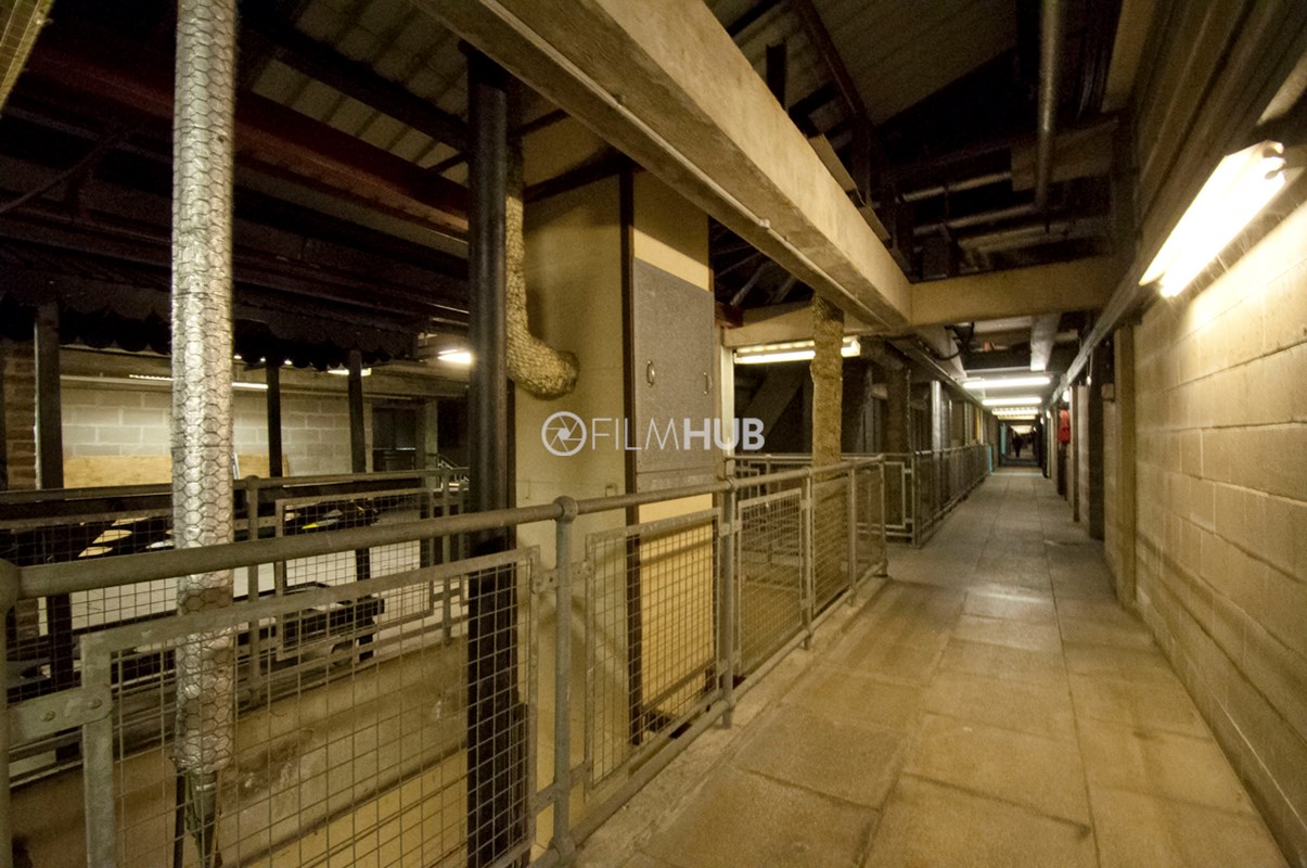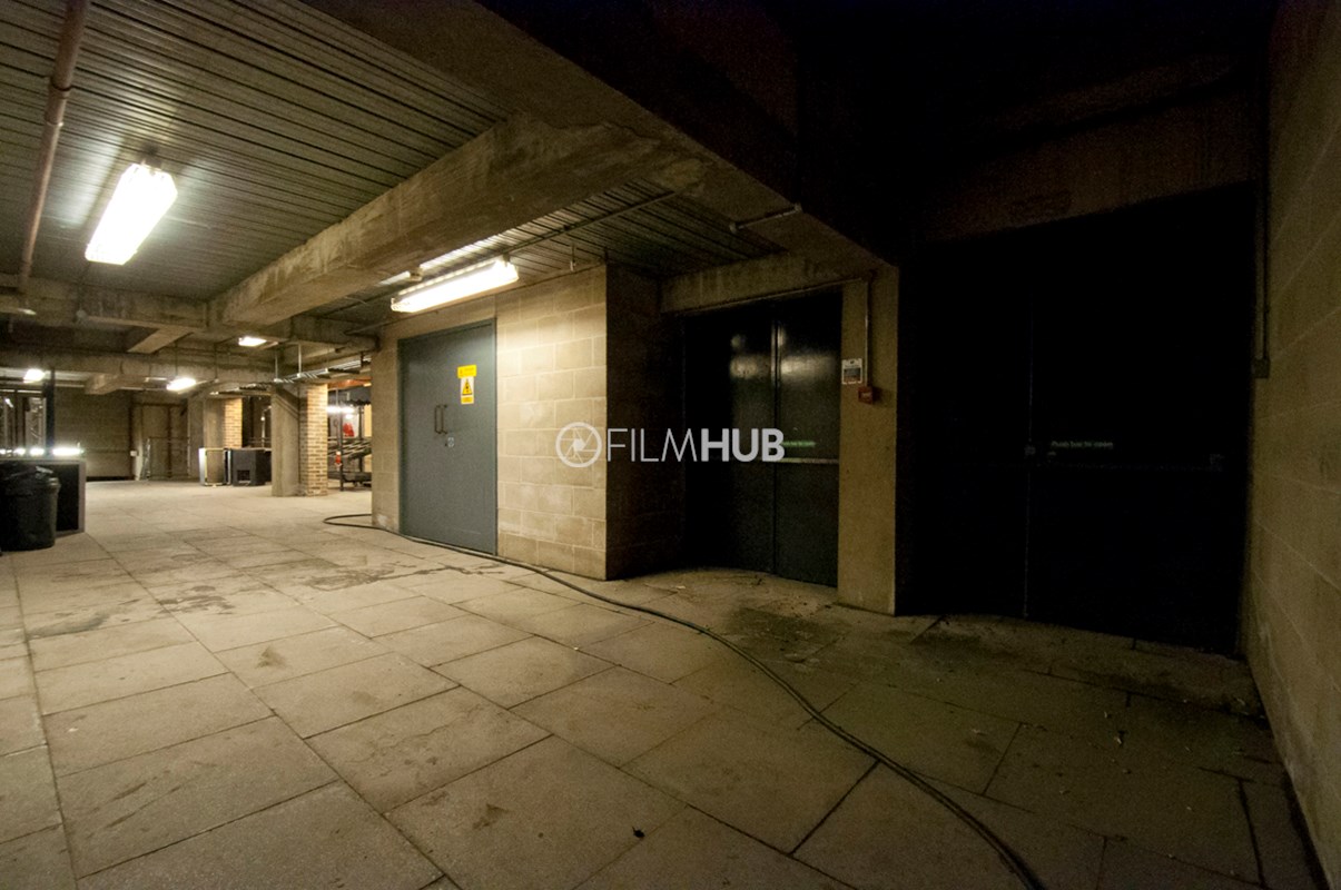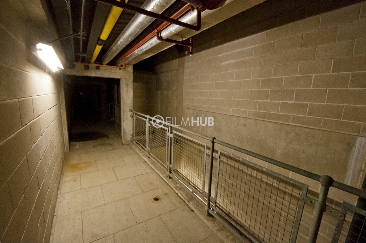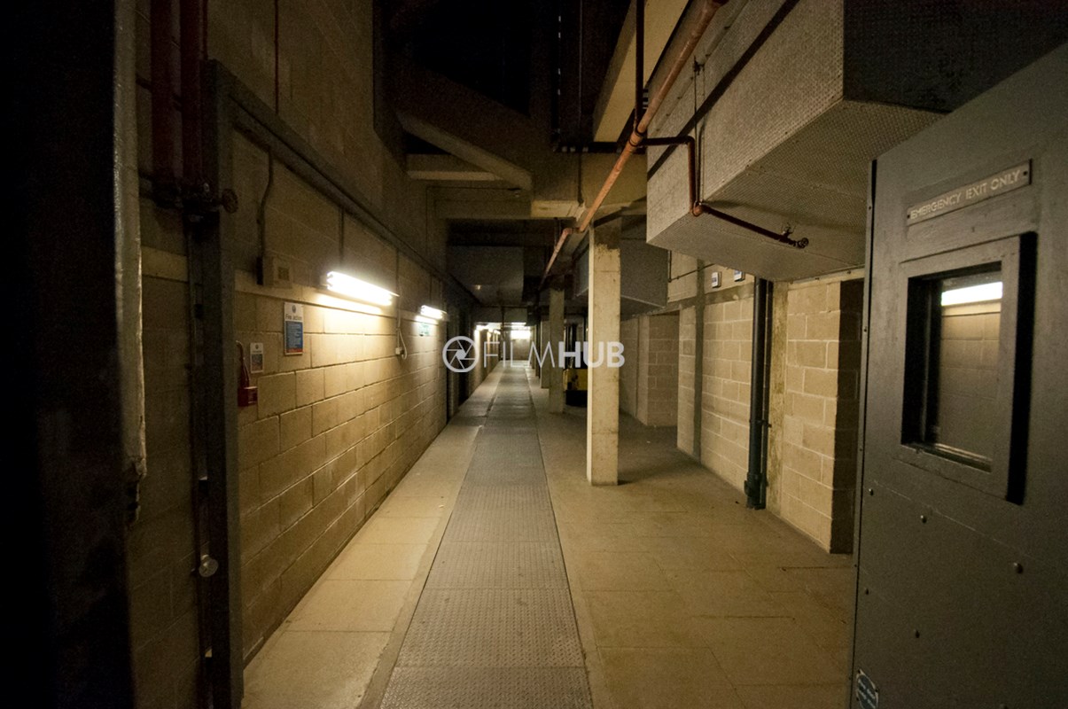 Back-of-house corridors with raw, industrial textures and controllable lighting. Long runs of corridor space feature concrete floors and pillars, breeze block walls, and exposed pipework with air-conditioning units and vents. Two large stairwells connect levels, and freight lifts serve the area. Suitable for scenes set in service corridors, backstage areas or industrial environments.Restrictions