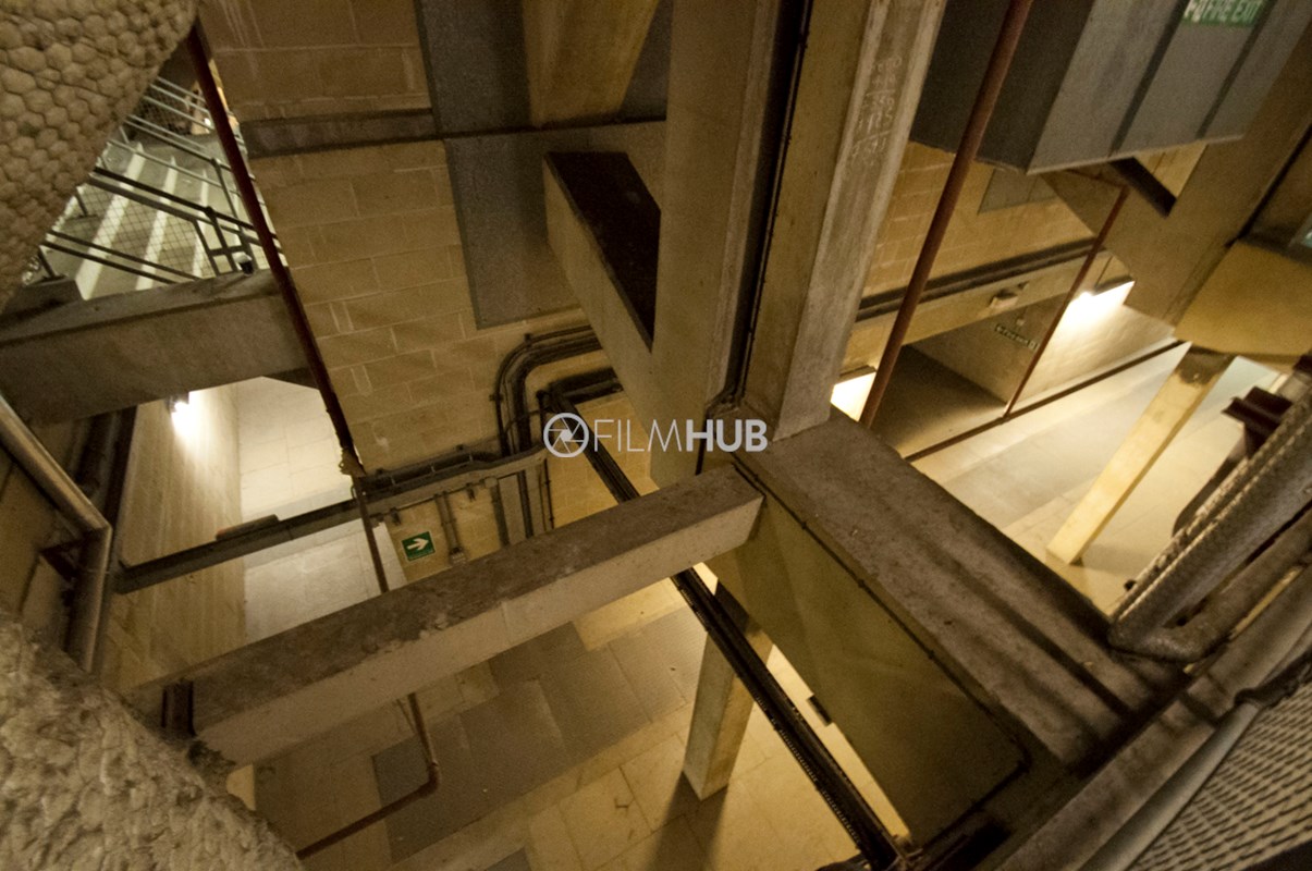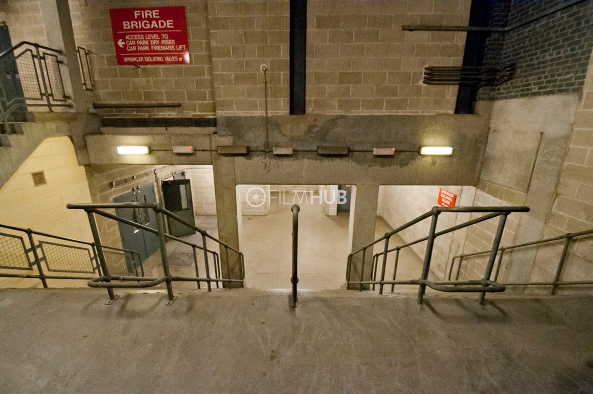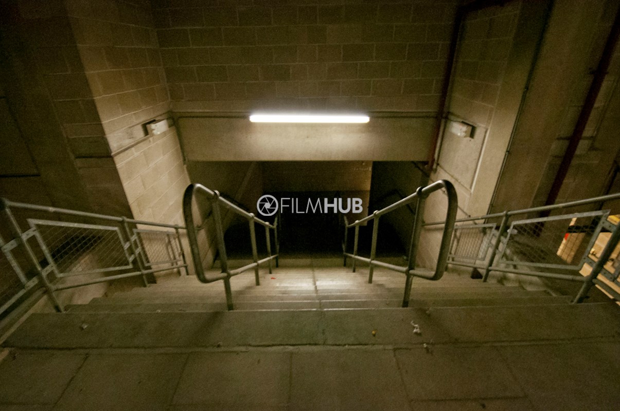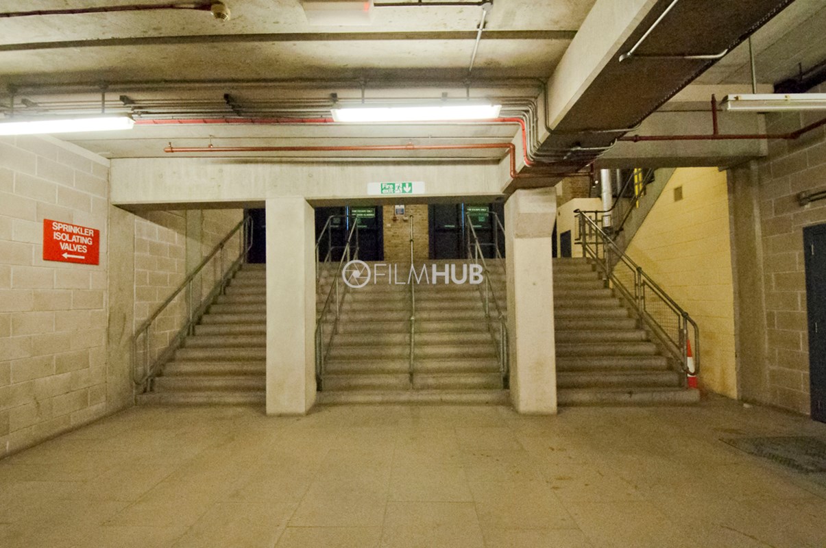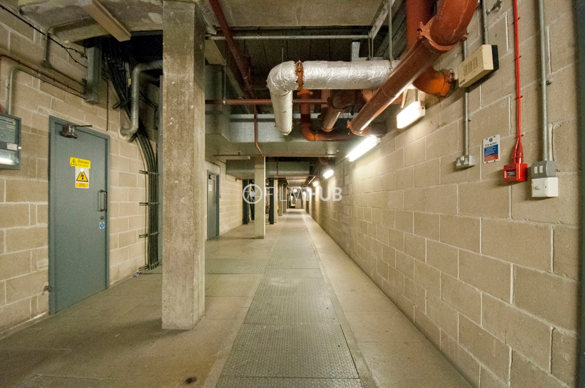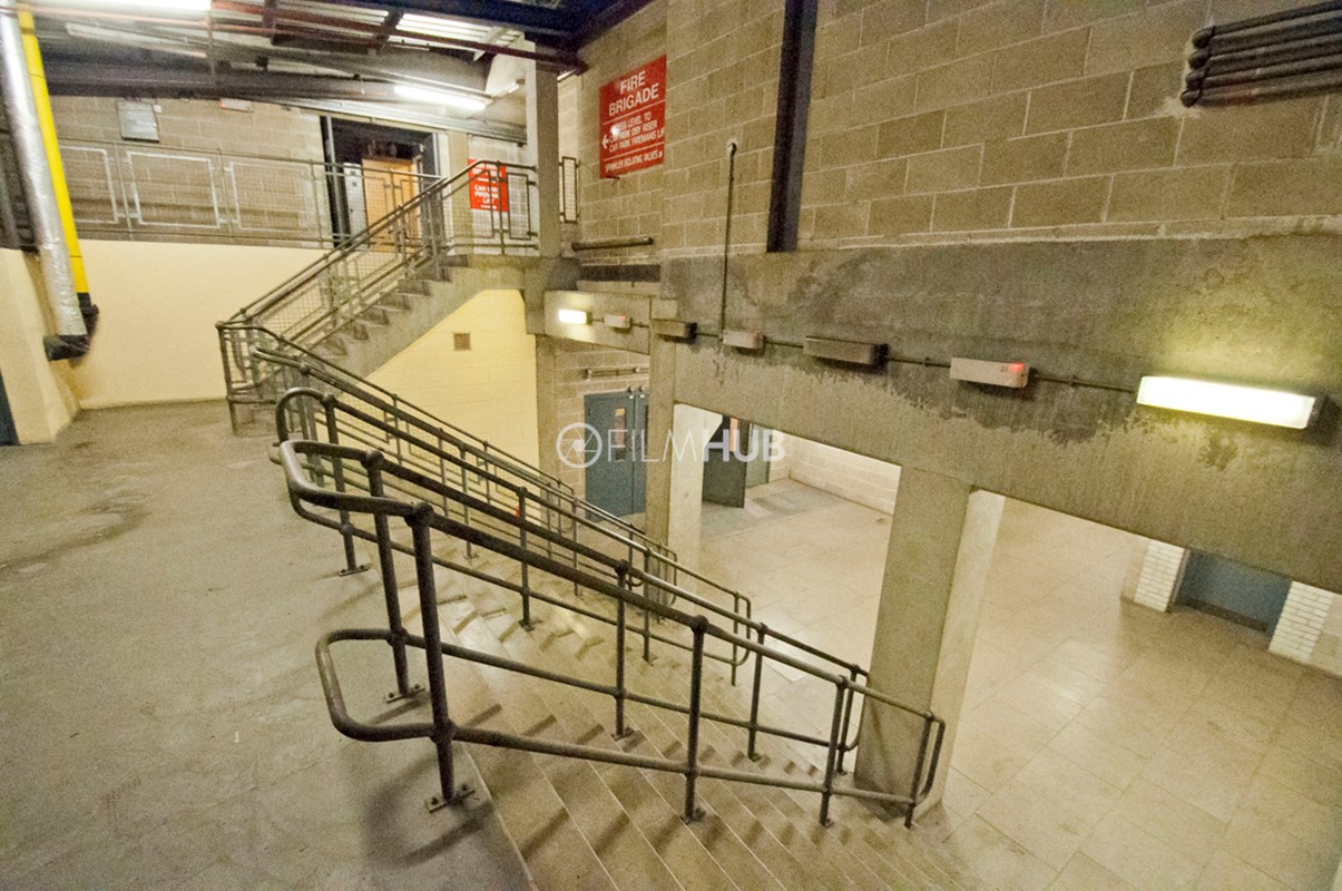 Back-of-house corridors with raw, industrial textures and controllable lighting. Long runs of corridor space feature concrete floors and pillars, breeze block walls, and exposed pipework with air-conditioning units and vents. Two large stairwells connect levels, and freight lifts serve the area. Suitable for scenes set in service corridors, backstage areas or industrial environments.Restrictions