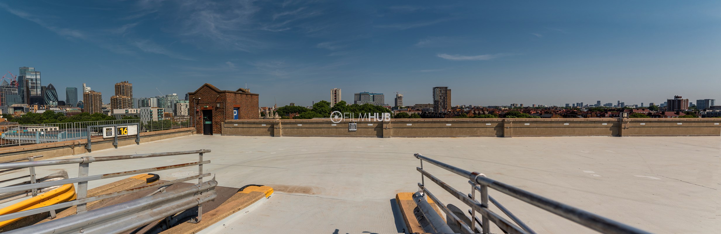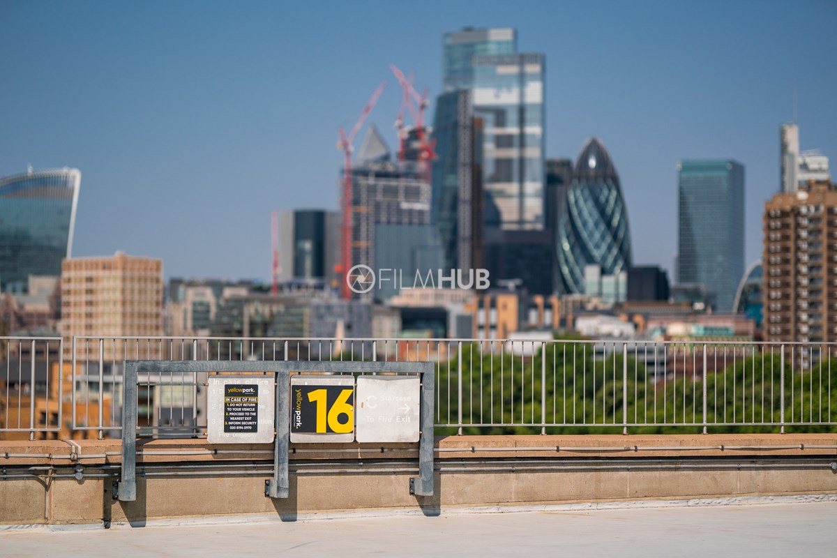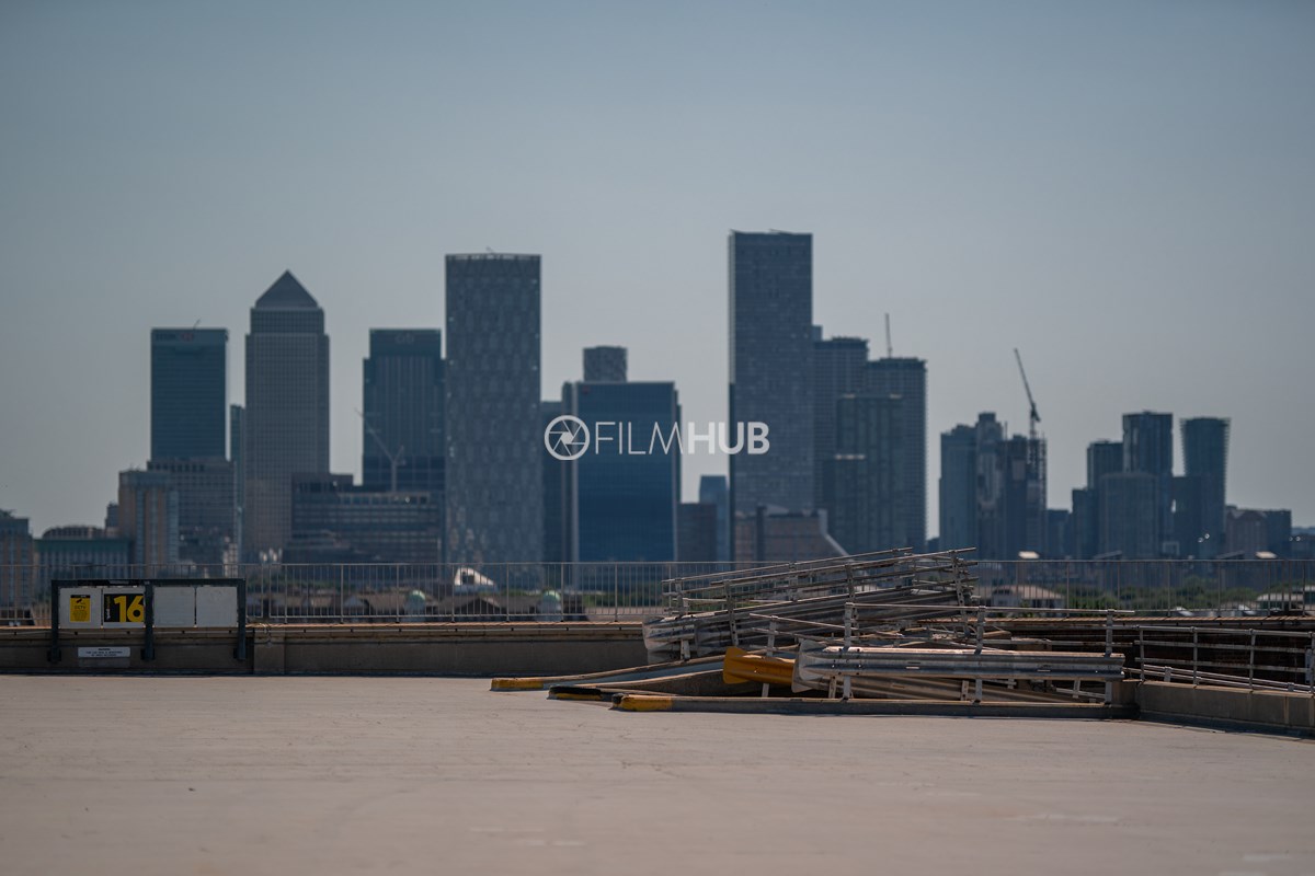 With fantastic, near 360 skyline degree views of London from the open air rooftop / upper level (with only the the southerly view of the Thames obstructed), the multi-storey car park at Tobacco Dock is a fantastic location for establishing shots of London.