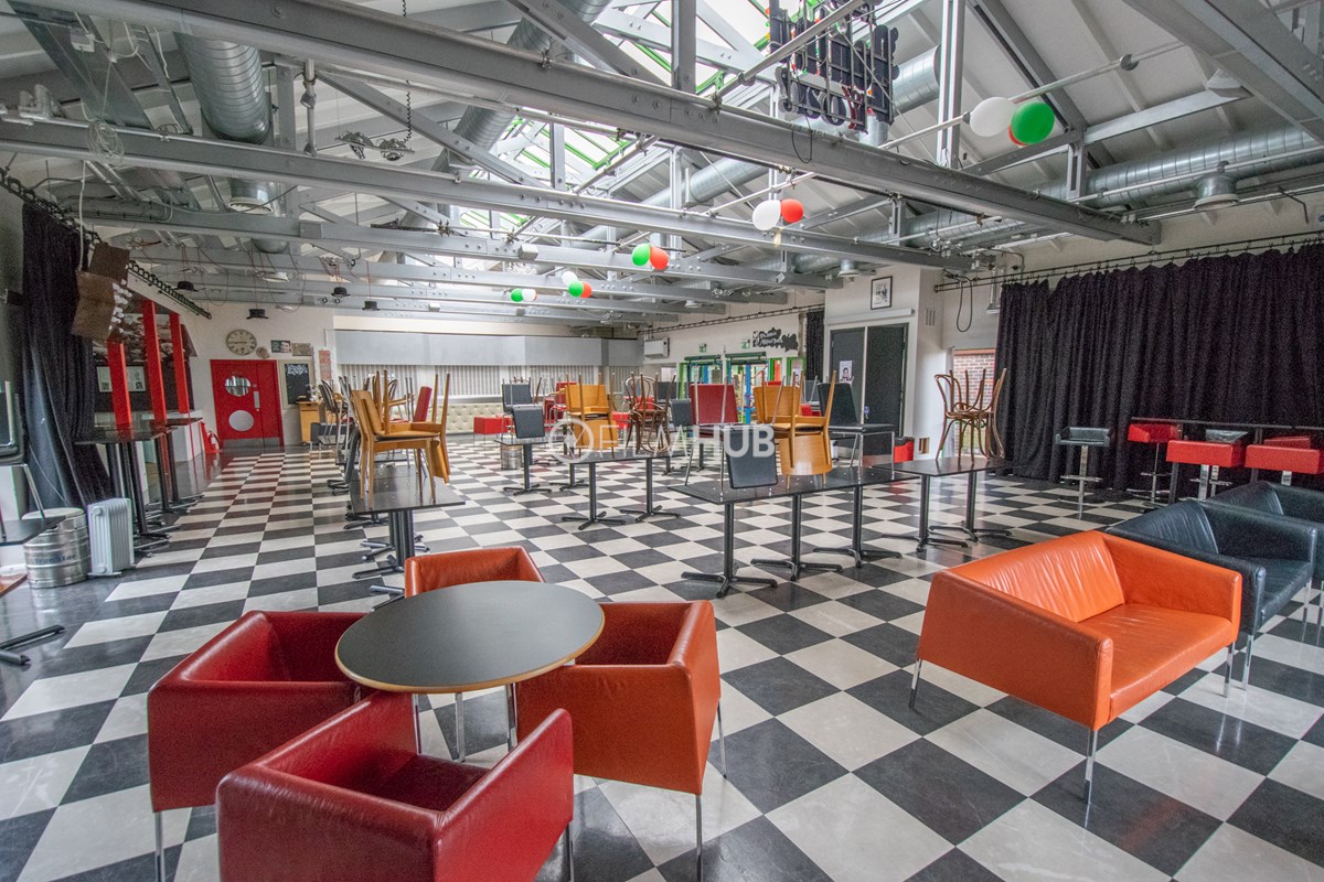 The American Diner themed bar located off the main entrance to the theatre includes a funky black and white tiled floor and exposed metal beams.